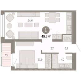 Однокомнатная квартира с первичной отделкой в ЖК ''Нефть'' на 6 этаже. Общая площадь: 49.9 кв.м., жилая: 11.9 кв.м., площадь просторной кухни-гостиной: 24.5 кв.м. Все окна выходят на одну сторону. В квартире одна лоджия, один совмещенный санузел. Высота потолков 2.7 м. Дом монолитный, многоподъездный, переменной этажности, от 7 до 17 этажей. Квартира находится в 6-й секции высотой 7 этажей в корпусе 1. На этаже 6 квартир. В подъезде 1 грузовой лифт. Окончание строительства - 2 квартал 2027 года. Оформление сделки по договору долевого участия. Квартира с кухней-гостиной и одной спальней в квартале ''Нефть''. Особенности планировки: предчистовая отделка, балкон. квартиры в нашей базе: НФТ01-Ж6.6.3. Квартал ''Нефть'' построят в микрорайоне ''нефтяников''. Квартал состоит из четырёх жилых домов 7 — 9 этажей с акцентной башней в 17 этажей, подземными автостоянками и помещениями коммерческого назначения. Квартал находится в юго-западной части Сургута на пересечении Набережного проспекта и улицы Артёма. В районе уже сформированная инфраструктура. Рядом расположены три детских сада, университеты, парк и спортивная база. На первых этажах квартала спроектированы коммерческие помещения под повседневные сервисы для жителей: магазины, кафе, аптеки и другие полезные функции. Дом имеет переменную высотность 717 этажей. Секции высотой 7-9 этажей подразумевают небольшое количество соседей, спокойствие и приватность. Башня высотой в 17 этажей предлагает более динамичный характер проживания, здесь будет комфортно любителям активного городского ритма жизни. Дворы приватные и предназначены только для жителей. По стандартам Брусники зелень занимает 70% территории. В квартале ''Нефть'' озеленение выполнено по принципу долголетия ландшафта: оно плотное, разнообразное и многоярусное. Самый верхний ярус — взрослые деревья со сформированной кроной и высокие кустарники, ниже располагаются массивы кустарников среднего размера, нижний ярус — травы, многолетники и газон. Все растения подобраны с учётом сезонности и календаря цветения и сурового климата северного города. Осенью цвет ландшафта обеспечивает листва деревьев и кустарников, летом — цветение многолетников, зимой — вечнозелёные хвойные растения и кустарники с декоративными свойствами стеблей. #Z4CTV1