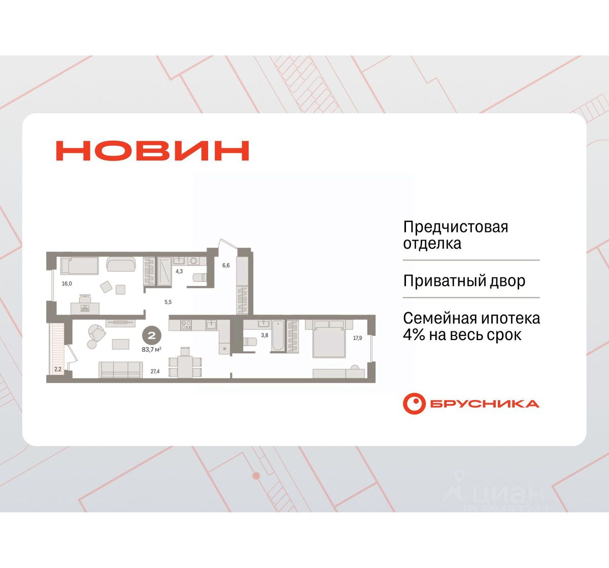 Готовые квартиры со скидкой до 35%. Информация по телефону, мы вам все подробно расскажем! Продается 2-комн. квартира с первичной отделкой в ЖК ''Новин'' на 8 этаже. Общая площадь: 83.69 кв.м., жилая: 33.9 кв.м., площадь просторной кухни-гостиной: 27.4 кв.м. Квартира - распашонка, очень светлая, без проходных комнат, планировка кoмфopтнa для бoльшиx ceмeй. В квартире одна лоджия, два совмещенных санузла. Высота потолков 2.7 м. Дом монолитный, многоподъездный, переменной этажности, от 8 до 17 этажей. Квартира находится во 2-й секции высотой 9 этажей в корпусе 7. На этаже 7 квартир. В подъезде 1 пассажирский и 1 грузовой лифт. Окончание строительства - 2 квартал 2027 года. Оформление сделки по договору долевого участия. Квартира с кухней-гостиной и двумя спальнями в квартале ''Новин''. Особенности планировки: окна на две стороны, вид во двор, лоджия, разнесённые спальни, предчистовая отделка, мастер-спальня. квартиры в нашей базе: НСВ07-Ж2.8.2. Квартал ''Новин'' расположен на западе Сургута в районе с хорошо развитой инфраструктурой. Рядом — парк ''Кедровый Лог'', детские сады, поликлиника, продуктовые магазины и торговые центры. До центра города — 20 минут на автомобиле. Пять домов уже заселены. Ещё три находятся на этапе возведения. Квартал находится в западной части Сургута на пересечении Югорского тракта и улицы Игоря Киртбая. Можно быстро добраться до любой точки города по Югорскому тракту. В районе уже сформированная инфраструктура. Рядом расположены крупные торговые центры, три детских сада, поликлиника, парк и спортивная база. На первых этажах квартала спроектированы коммерческие помещения под повседневные сервисы для жителей: магазины, кафе, аптеки и другие полезные функции. Проектом развития территории предусмотрено строительство детского сада и общеобразовательной школы. Во дворах предусмотрены сценарии для разных категорий жителей, в том числе и площадки для тихого отдыха с фонтаном и арт объектом. Детская площадка раскрывает игровой потенциал территории за счёт разных возможных типов взаимодействий, среди которых присутствуют: контакт с природой, смена уровня игры и контролируемый риск, сотрудничество и игра в команде, а также спокойный сценарий с качелями. Между домами второй очереди мы спроектировали общественное пространство. Здесь также расположатся спортивные и игровые площадки, велопарковки и площадь событий. Главной точкой притяжения станет фонтан. #25Vgtf