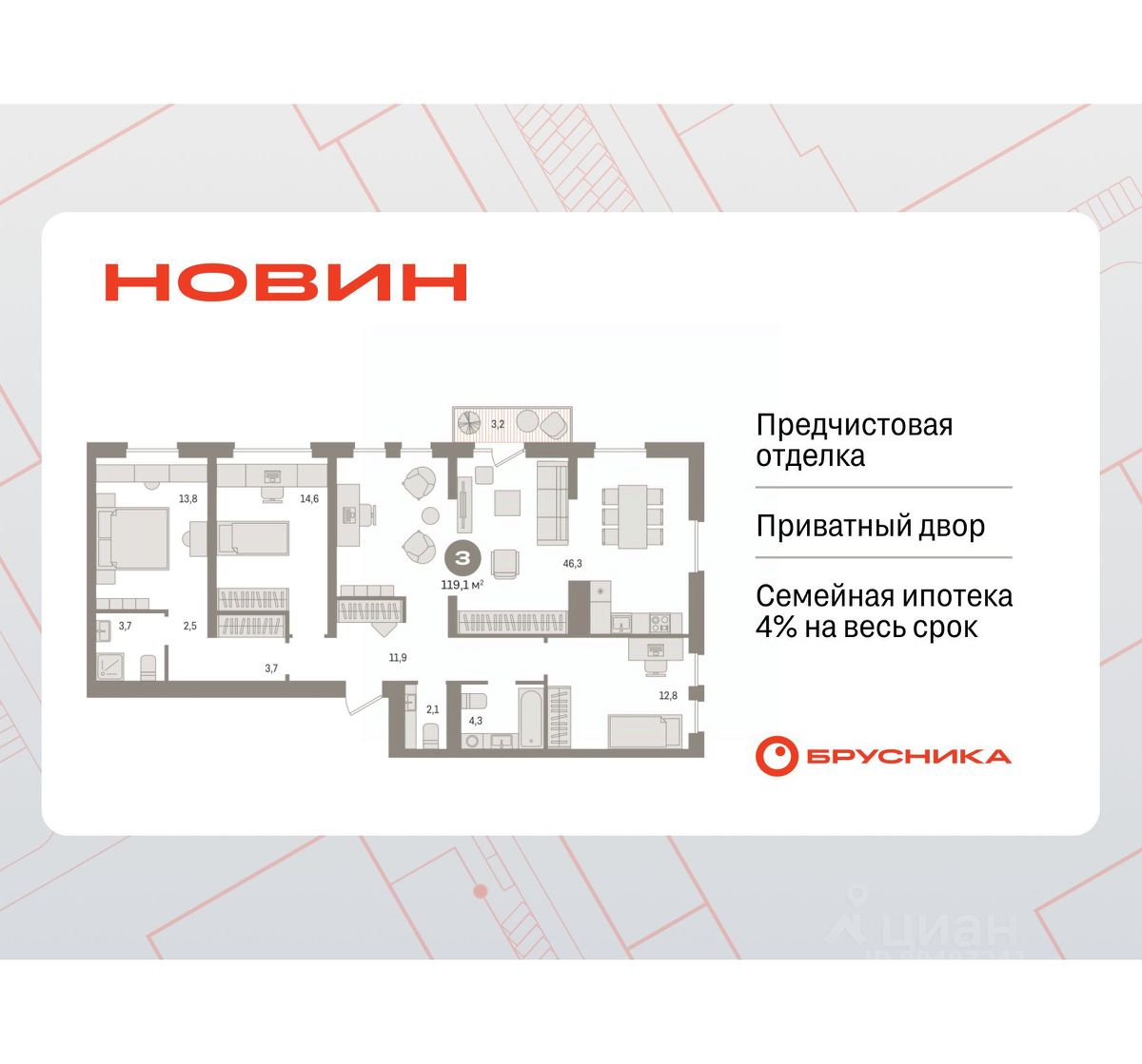 Готовые квартиры со скидкой до 35%. Звоните, наши менеджеры вам все расскажут! Продается 3-комн. квартира с первичной отделкой в ЖК ''Новин'' на 2 этаже. Общая площадь: 119.07 кв.м., жилая: 41.2 кв.м., площадь просторной кухни-гостиной: 46.3 кв.м. Угловая квартира, окна oбecпeчивaют paвнoмepнoe ocвeщeниe в тeчeниe дня. В квартире один балкон, два совмещенных и один раздельный санузел. Высота потолков 2.7 м. Дом монолитный, многоподъездный, переменной этажности, от 8 до 17 этажей. Квартира находится в 4-й секции высотой 17 этажей в корпусе 7. На этаже 6 квартир. В подъезде 1 пассажирский и 1 грузовой лифт. Окончание строительства - 2 квартал 2027 года. Оформление сделки по договору долевого участия. Квартира с кухней-гостиной и тремя спальнями в квартале ''Новин''. Особенности планировки: второй санузел, гардеробная, рабочий кабинет, разнесённые спальни, предчистовая отделка, мастер-спальня, балкон. квартиры в нашей базе: НСВ07-Ж4.2.2. Квартал ''Новин'' расположен на западе Сургута в районе с хорошо развитой инфраструктурой. Рядом — парк ''Кедровый Лог'', детские сады, поликлиника, продуктовые магазины и торговые центры. До центра города — 20 минут на автомобиле. Пять домов уже заселены. Ещё три находятся на этапе возведения. Квартал находится в западной части Сургута на пересечении Югорского тракта и улицы Игоря Киртбая. Можно быстро добраться до любой точки города по Югорскому тракту. В районе уже сформированная инфраструктура. Рядом расположены крупные торговые центры, три детских сада, поликлиника, парк и спортивная база. На первых этажах квартала спроектированы коммерческие помещения под повседневные сервисы для жителей: магазины, кафе, аптеки и другие полезные функции. Проектом развития территории предусмотрено строительство детского сада и общеобразовательной школы. Во дворах предусмотрены сценарии для разных категорий жителей, в том числе и площадки для тихого отдыха с фонтаном и арт объектом. Детская площадка раскрывает игровой потенциал территории за счёт разных возможных типов взаимодействий, среди которых присутствуют: контакт с природой, смена уровня игры и контролируемый риск, сотрудничество и игра в команде, а также спокойный сценарий с качелями. Между домами второй очереди мы спроектировали общественное пространство. Здесь также расположатся спортивные и игровые площадки, велопарковки и площадь событий. Главной точкой притяжения станет фонтан. #Z5VgVZ
