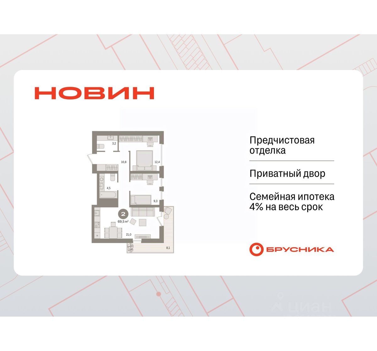Готовые квартиры со скидкой до 35%. Звоните, наши менеджеры вам все расскажут! 2-комн. квартира с первичной отделкой в ЖК ''Новин'' на 4 этаже. Общая площадь: 69.48 кв.м., жилая: 21.7 кв.м., площадь просторной кухни-гостиной: 21 кв.м. Квартира угловая, окна oбecпeчивaют paвнoмepнoe ocвeщeниe в тeчeниe дня. В квартире один балкон, один совмещенный и один раздельный санузел. Высота потолков 2.7 м. Дом монолитный, многоподъездный, переменной этажности, от 8 до 17 этажей. Квартира находится в 1-й секции высотой 15 этажей в корпусе 7. На этаже 7 квартир. В подъезде 1 пассажирский и 1 грузовой лифт. Окончание строительства - 2 квартал 2027 года. Оформление сделки по договору долевого участия. Квартира с кухней-гостиной и двумя спальнями в квартале ''Новин''. Особенности планировки: второй санузел, гардеробная, вид во двор, предчистовая отделка, балкон. квартиры в нашей базе: НСВ07-Ж1.4.1. Квартал ''Новин'' расположен на западе Сургута в районе с хорошо развитой инфраструктурой. Рядом — парк ''Кедровый Лог'', детские сады, поликлиника, продуктовые магазины и торговые центры. До центра города — 20 минут на автомобиле. Пять домов уже заселены. Ещё три находятся на этапе возведения. Квартал находится в западной части Сургута на пересечении Югорского тракта и улицы Игоря Киртбая. Можно быстро добраться до любой точки города по Югорскому тракту. В районе уже сформированная инфраструктура. Рядом расположены крупные торговые центры, три детских сада, поликлиника, парк и спортивная база. На первых этажах квартала спроектированы коммерческие помещения под повседневные сервисы для жителей: магазины, кафе, аптеки и другие полезные функции. Проектом развития территории предусмотрено строительство детского сада и общеобразовательной школы. Во дворах предусмотрены сценарии для разных категорий жителей, в том числе и площадки для тихого отдыха с фонтаном и арт объектом. Детская площадка раскрывает игровой потенциал территории за счёт разных возможных типов взаимодействий, среди которых присутствуют: контакт с природой, смена уровня игры и контролируемый риск, сотрудничество и игра в команде, а также спокойный сценарий с качелями. Между домами второй очереди мы спроектировали общественное пространство. Здесь также расположатся спортивные и игровые площадки, велопарковки и площадь событий. Главной точкой притяжения станет фонтан. #zsv9Di