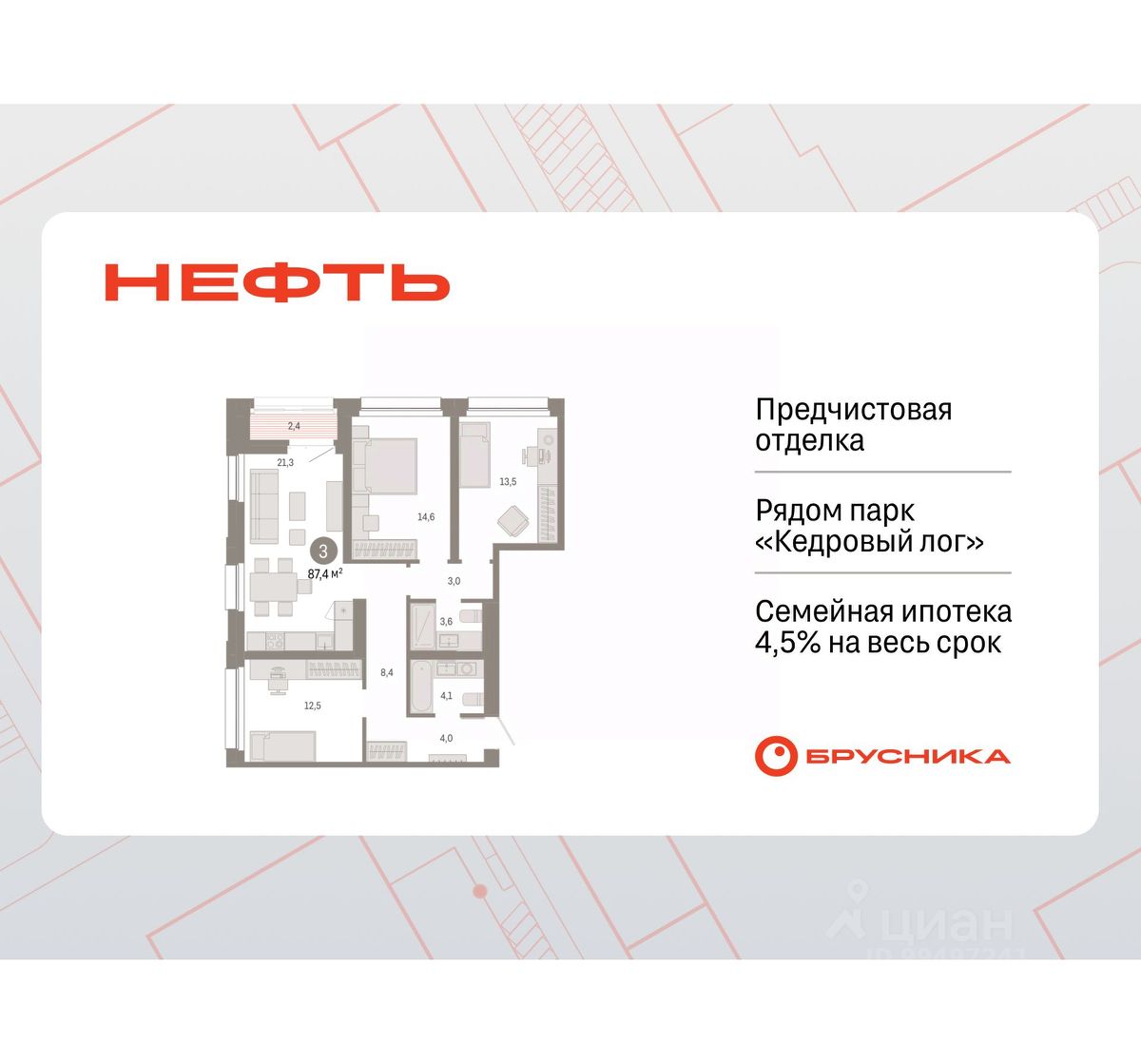 Продается трехкомнатная квартира с первичной отделкой в ЖК ''Нефть'' на 14 этаже. Общая площадь: 87.4 кв.м., жилая: 40.6 кв.м., площадь просторной кухни-гостиной: 21.3 кв.м. Угловая квартира, окна oбecпeчивaют paвнoмepнoe ocвeщeниe в тeчeниe дня. В квартире одна лоджия, два совмещенных санузла. Высота потолков 2.7 м. Дом монолитный, многоподъездный, переменной этажности, от 7 до 17 этажей. Квартира находится в 3-й секции высотой 17 этажей в корпусе 1. На этаже 8 квартир. В подъезде 1 пассажирский и 1 грузовой лифт. Окончание строительства - 2 квартал 2027 года. Оформление сделки по договору долевого участия. Квартира с кухней-гостиной и тремя спальнями в квартале ''Нефть''. Особенности планировки: второй санузел, лоджия, разнесённые спальни, предчистовая отделка. квартиры в нашей базе: НФТ01-Ж3.14.1. Квартал ''Нефть'' построят в микрорайоне ''нефтяников''. Квартал состоит из четырёх жилых домов 7 — 9 этажей с акцентной башней в 17 этажей, подземными автостоянками и помещениями коммерческого назначения. Квартал находится в юго-западной части Сургута на пересечении Набережного проспекта и улицы Артёма. В районе уже сформированная инфраструктура. Рядом расположены три детских сада, университеты, парк и спортивная база. На первых этажах квартала спроектированы коммерческие помещения под повседневные сервисы для жителей: магазины, кафе, аптеки и другие полезные функции. Дом имеет переменную высотность 717 этажей. Секции высотой 7-9 этажей подразумевают небольшое количество соседей, спокойствие и приватность. Башня высотой в 17 этажей предлагает более динамичный характер проживания, здесь будет комфортно любителям активного городского ритма жизни. Дворы приватные и предназначены только для жителей. По стандартам Брусники зелень занимает 70% территории. В квартале ''Нефть'' озеленение выполнено по принципу долголетия ландшафта: оно плотное, разнообразное и многоярусное. Самый верхний ярус — взрослые деревья со сформированной кроной и высокие кустарники, ниже располагаются массивы кустарников среднего размера, нижний ярус — травы, многолетники и газон. Все растения подобраны с учётом сезонности и календаря цветения и сурового климата северного города. Осенью цвет ландшафта обеспечивает листва деревьев и кустарников, летом — цветение многолетников, зимой — вечнозелёные хвойные растения и кустарники с декоративными свойствами стеблей. #zSV9Bw