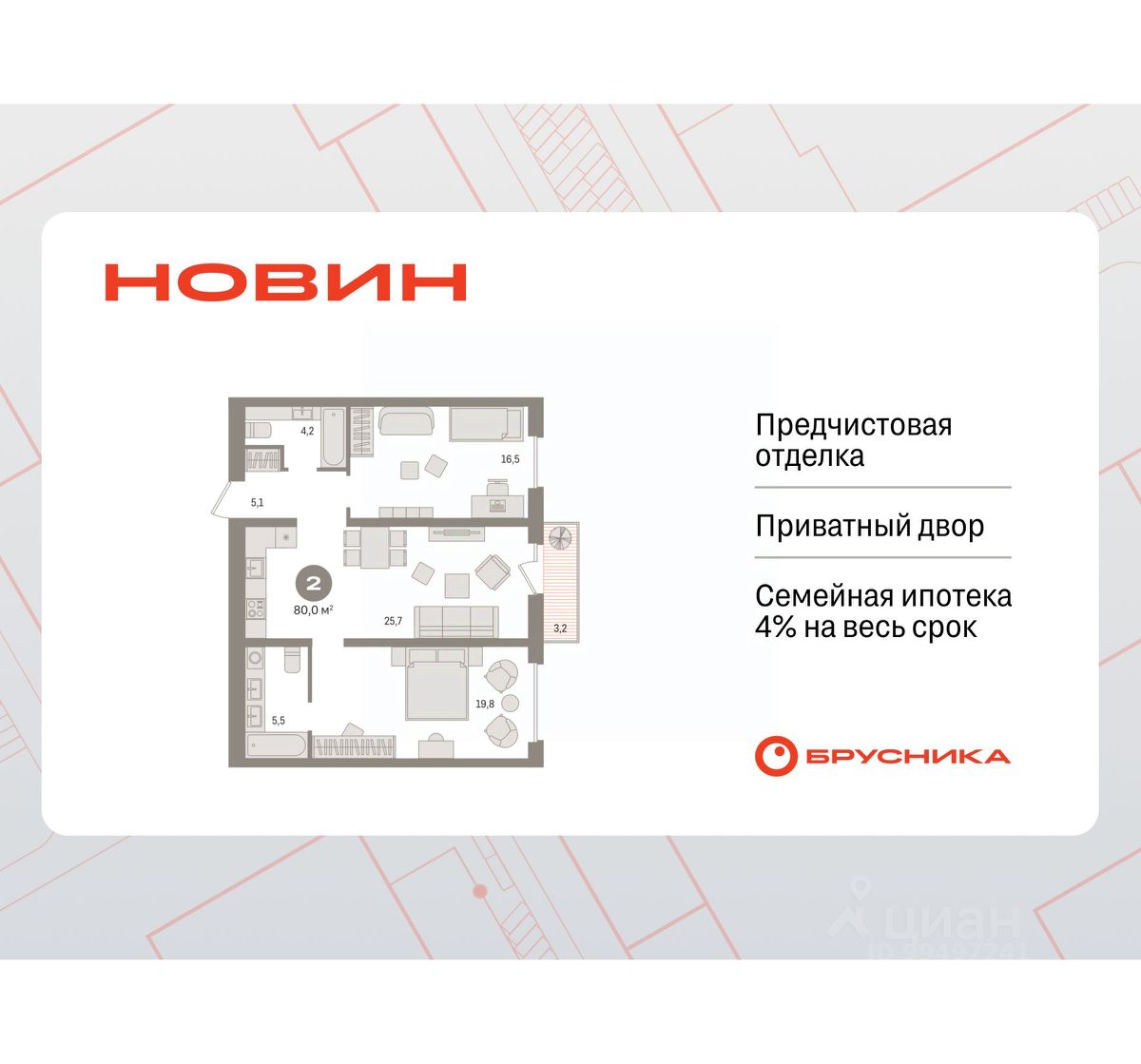 Готовые квартиры со скидкой до 35%. По всем вопросам звоните в офис продаж, наши менеджеры вам все расскажут! Продается 2-комн. квартира от застройщика с первичной отделкой в ЖК ''Новин'' на 5 этаже. Общая площадь: 80.04 кв.м., жилая: 36.3 кв.м., площадь просторной кухни-гостиной: 25.7 кв.м. Комнаты изолированные, все окна выходят на одну сторону. В квартире один балкон, два совмещенных санузла. Высота потолков 2.7 м. Дом монолитный, многоподъездный, переменной этажности, от 8 до 17 этажей. Квартира находится в 5-й секции высотой 8 этажей в корпусе 7. На этаже 6 квартир. В подъезде 1 пассажирский и 1 грузовой лифт. Окончание строительства - 2 квартал 2027 года. Оформление сделки по договору долевого участия. Квартира с кухней-гостиной и двумя спальнями в квартале ''Новин''. Особенности планировки: гардеробная, разнесённые спальни, предчистовая отделка, мастер-спальня, балкон. квартиры в нашей базе: НСВ07-Ж5.5.4. Квартал ''Новин'' расположен на западе Сургута в районе с хорошо развитой инфраструктурой. Рядом — парк ''Кедровый Лог'', детские сады, поликлиника, продуктовые магазины и торговые центры. До центра города — 20 минут на автомобиле. Пять домов уже заселены. Ещё три находятся на этапе возведения. Квартал находится в западной части Сургута на пересечении Югорского тракта и улицы Игоря Киртбая. Можно быстро добраться до любой точки города по Югорскому тракту. В районе уже сформированная инфраструктура. Рядом расположены крупные торговые центры, три детских сада, поликлиника, парк и спортивная база. На первых этажах квартала спроектированы коммерческие помещения под повседневные сервисы для жителей: магазины, кафе, аптеки и другие полезные функции. Проектом развития территории предусмотрено строительство детского сада и общеобразовательной школы. Во дворах предусмотрены сценарии для разных категорий жителей, в том числе и площадки для тихого отдыха с фонтаном и арт объектом. Детская площадка раскрывает игровой потенциал территории за счёт разных возможных типов взаимодействий, среди которых присутствуют: контакт с природой, смена уровня игры и контролируемый риск, сотрудничество и игра в команде, а также спокойный сценарий с качелями. Между домами второй очереди мы спроектировали общественное пространство. Здесь также расположатся спортивные и игровые площадки, велопарковки и площадь событий. Главной точкой притяжения станет фонтан. #2Svg6a