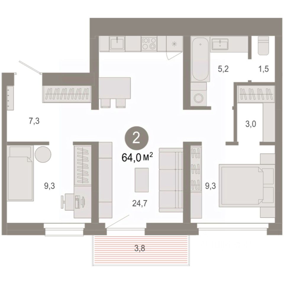 Продается двухкомнатная квартира от застройщика с первичной отделкой в ЖК ''Нефть'' на 7 этаже. Общая площадь: 64.04 кв.м., жилая: 18.6 кв.м., площадь просторной кухни-гостиной: 24.7 кв.м. Комнаты изолированные, все окна выходят на одну сторону. В квартире один балкон, один совмещенный санузел. Высота потолков 2.7 м. Дом монолитный, многоподъездный, переменной этажности, от 7 до 9 этажей. Квартира находится в 1-й секции высотой 7 этажей в корпусе 2. На этаже 10 квартир. В подъезде 1 пассажирский и 1 грузовой лифт. Окончание строительства - 3 квартал 2027 года. Оформление сделки по договору долевого участия. Квартира с кухней-гостиной и двумя спальнями в квартале ''Нефть''. Особенности планировки: гардеробная, вид во двор, разнесённые спальни, предчистовая отделка, балкон. квартиры в нашей базе: НФТ02-Ж1.7.7. Квартал ''Нефть'' построят в микрорайоне ''нефтяников''. Квартал состоит из четырёх жилых домов 7 — 9 этажей с акцентной башней в 17 этажей, подземными автостоянками и помещениями коммерческого назначения. Квартал находится в юго-западной части Сургута на пересечении Набережного проспекта и улицы Артёма. В районе уже сформированная инфраструктура. Рядом расположены три детских сада, университеты, парк и спортивная база. На первых этажах квартала спроектированы коммерческие помещения под повседневные сервисы для жителей: магазины, кафе, аптеки и другие полезные функции. Дом имеет переменную высотность 717 этажей. Секции высотой 7-9 этажей подразумевают небольшое количество соседей, спокойствие и приватность. Башня высотой в 17 этажей предлагает более динамичный характер проживания, здесь будет комфортно любителям активного городского ритма жизни. Дворы приватные и предназначены только для жителей. По стандартам Брусники зелень занимает 70% территории. В квартале ''Нефть'' озеленение выполнено по принципу долголетия ландшафта: оно плотное, разнообразное и многоярусное. Самый верхний ярус — взрослые деревья со сформированной кроной и высокие кустарники, ниже располагаются массивы кустарников среднего размера, нижний ярус — травы, многолетники и газон. Все растения подобраны с учётом сезонности и календаря цветения и сурового климата северного города. Осенью цвет ландшафта обеспечивает листва деревьев и кустарников, летом — цветение многолетников, зимой — вечнозелёные хвойные растения и кустарники с декоративными свойствами стеблей. #25do0D
