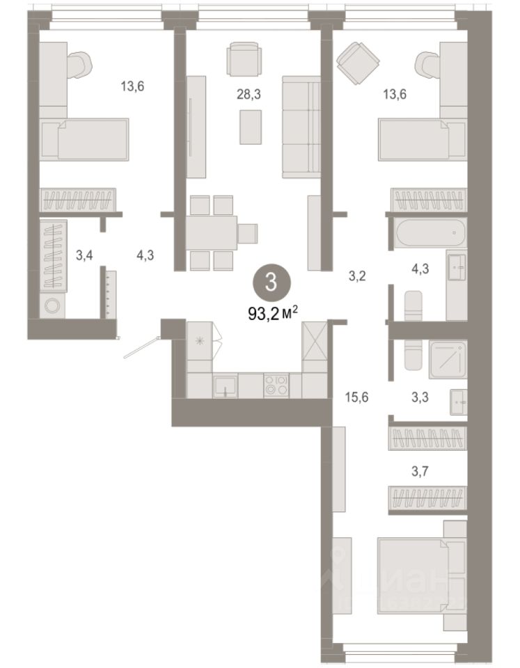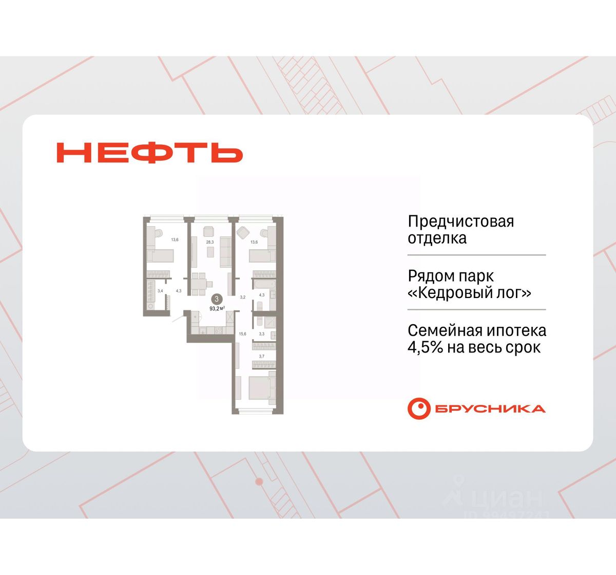 Продается 3-комн. квартира от застройщика с первичной отделкой в ЖК ''Нефть'' на 2 этаже. Общая площадь: 93.2 кв.м., жилая: 42.8 кв.м., площадь просторной кухни-гостиной: 28.3 кв.м. Квартира - распашонка, без проходных комнат, окна выходят на paзные стороны дома. В квартире два совмещенных санузла. Высота потолков 2.7 м. Дом монолитный, многоподъездный, переменной этажности, от 7 до 9 этажей. Квартира находится во 2-й секции высотой 9 этажей в корпусе 2. На этаже 3 квартиры. В подъезде 1 пассажирский и 1 грузовой лифт. Окончание строительства - 3 квартал 2027 года. Оформление сделки по договору долевого участия. Квартира с кухней-гостиной и тремя спальнями в квартале ''Нефть''. Особенности планировки: окна на две стороны, гардеробная, вид во двор, разнесённые спальни, предчистовая отделка, мастер-спальня, постирочная. квартиры в нашей базе: НФТ02-Ж2.2.2. Квартал ''Нефть'' построят в микрорайоне ''нефтяников''. Квартал состоит из четырёх жилых домов 7 — 9 этажей с акцентной башней в 17 этажей, подземными автостоянками и помещениями коммерческого назначения. Квартал находится в юго-западной части Сургута на пересечении Набережного проспекта и улицы Артёма. В районе уже сформированная инфраструктура. Рядом расположены три детских сада, университеты, парк и спортивная база. На первых этажах квартала спроектированы коммерческие помещения под повседневные сервисы для жителей: магазины, кафе, аптеки и другие полезные функции. Дом имеет переменную высотность 717 этажей. Секции высотой 7-9 этажей подразумевают небольшое количество соседей, спокойствие и приватность. Башня высотой в 17 этажей предлагает более динамичный характер проживания, здесь будет комфортно любителям активного городского ритма жизни. Дворы приватные и предназначены только для жителей. По стандартам Брусники зелень занимает 70% территории. В квартале ''Нефть'' озеленение выполнено по принципу долголетия ландшафта: оно плотное, разнообразное и многоярусное. Самый верхний ярус — взрослые деревья со сформированной кроной и высокие кустарники, ниже располагаются массивы кустарников среднего размера, нижний ярус — травы, многолетники и газон. Все растения подобраны с учётом сезонности и календаря цветения и сурового климата северного города. Осенью цвет ландшафта обеспечивает листва деревьев и кустарников, летом — цветение многолетников, зимой — вечнозелёные хвойные растения и кустарники с декоративными свойствами стеблей. #zSdoWW