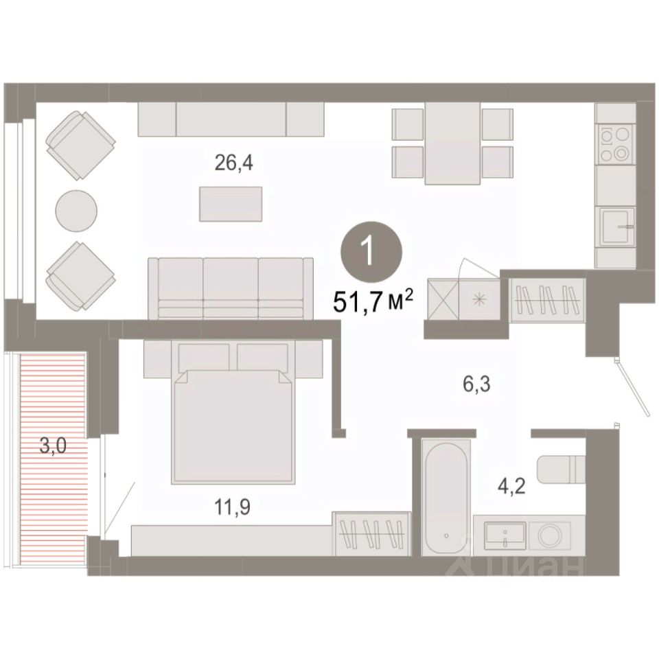 1-комн. квартира с первичной отделкой в ЖК ''Нефть'' на 6 этаже. Общая площадь: 51.7 кв.м., жилая: 11.9 кв.м., площадь просторной кухни-гостиной: 26.4 кв.м. Все окна выходят на одну сторону. В квартире одна лоджия, один совмещенный санузел. Высота потолков 2.7 м. Дом монолитный, многоподъездный, переменной этажности, от 7 до 9 этажей. Квартира находится в 1-й секции высотой 7 этажей в корпусе 2. На этаже 10 квартир. В подъезде 1 пассажирский и 1 грузовой лифт. Окончание строительства - 3 квартал 2027 года. Оформление сделки по договору долевого участия. Квартира с кухней-гостиной и одной спальней в квартале ''Нефть''. Особенности планировки: гардеробная, предчистовая отделка, балкон. квартиры в нашей базе: НФТ02-Ж1.6.7. Квартал ''Нефть'' построят в микрорайоне ''нефтяников''. Квартал состоит из четырёх жилых домов 7 — 9 этажей с акцентной башней в 17 этажей, подземными автостоянками и помещениями коммерческого назначения. Квартал находится в юго-западной части Сургута на пересечении Набережного проспекта и улицы Артёма. В районе уже сформированная инфраструктура. Рядом расположены три детских сада, университеты, парк и спортивная база. На первых этажах квартала спроектированы коммерческие помещения под повседневные сервисы для жителей: магазины, кафе, аптеки и другие полезные функции. Дом имеет переменную высотность 717 этажей. Секции высотой 7-9 этажей подразумевают небольшое количество соседей, спокойствие и приватность. Башня высотой в 17 этажей предлагает более динамичный характер проживания, здесь будет комфортно любителям активного городского ритма жизни. Дворы приватные и предназначены только для жителей. По стандартам Брусники зелень занимает 70% территории. В квартале ''Нефть'' озеленение выполнено по принципу долголетия ландшафта: оно плотное, разнообразное и многоярусное. Самый верхний ярус — взрослые деревья со сформированной кроной и высокие кустарники, ниже располагаются массивы кустарников среднего размера, нижний ярус — травы, многолетники и газон. Все растения подобраны с учётом сезонности и календаря цветения и сурового климата северного города. Осенью цвет ландшафта обеспечивает листва деревьев и кустарников, летом — цветение многолетников, зимой — вечнозелёные хвойные растения и кустарники с декоративными свойствами стеблей. #2SDO5f