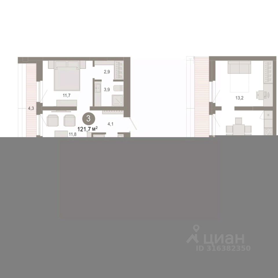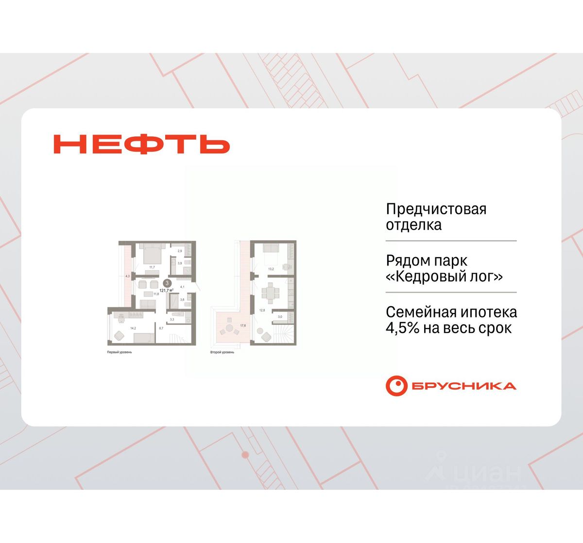 Продается 3-комн. квартира с первичной отделкой в ЖК ''Нефть'' на 7 этаже. Двухуровневая квартира, на каждом этаже вы можете выделить различные функциональные зоны. Общая площадь: 121.7 кв.м., жилая: 39.1 кв.м., площадь просторной кухни-гостиной: 12.9 кв.м. Комнаты изолированные, все окна выходят на одну сторону. В квартире один балкон и одна лоджия, один совмещенный санузел. Наличие террасы в квартире открывает возможность для обустройства дополнительной площади. Высота потолков 2.7 м. Дом монолитный, многоподъездный, переменной этажности, от 7 до 9 этажей. Квартира находится в 1-й секции высотой 7 этажей в корпусе 2. На этаже 10 квартир. В подъезде 1 пассажирский и 1 грузовой лифт. Окончание строительства - 3 квартал 2027 года. Оформление сделки по договору долевого участия. Двухуровневая квартира с кухней-гостиной и тремя спальнями в квартале ''Нефть''. Особенности планировки: двухуровневая, свободная планировка, терраса на крыше. квартиры в нашей базе: НФТ02-Ж1.7.4. Квартал ''Нефть'' построят в микрорайоне ''нефтяников''. Квартал состоит из четырёх жилых домов 7 — 9 этажей с акцентной башней в 17 этажей, подземными автостоянками и помещениями коммерческого назначения. Квартал находится в юго-западной части Сургута на пересечении Набережного проспекта и улицы Артёма. В районе уже сформированная инфраструктура. Рядом расположены три детских сада, университеты, парк и спортивная база. На первых этажах квартала спроектированы коммерческие помещения под повседневные сервисы для жителей: магазины, кафе, аптеки и другие полезные функции. Дом имеет переменную высотность 717 этажей. Секции высотой 7-9 этажей подразумевают небольшое количество соседей, спокойствие и приватность. Башня высотой в 17 этажей предлагает более динамичный характер проживания, здесь будет комфортно любителям активного городского ритма жизни. Дворы приватные и предназначены только для жителей. По стандартам Брусники зелень занимает 70% территории. В квартале ''Нефть'' озеленение выполнено по принципу долголетия ландшафта: оно плотное, разнообразное и многоярусное. Самый верхний ярус — взрослые деревья со сформированной кроной и высокие кустарники, ниже располагаются массивы кустарников среднего размера, нижний ярус — травы, многолетники и газон. Все растения подобраны с учётом сезонности и календаря цветения и сурового климата северного города. Осенью цвет ландшафта обеспечивает листва деревьев и кустарников, летом — цветение многолетников, зимой — вечнозелёные хвойные растения и кустарники с декоративными свойствами стеблей. #ZSdO7w