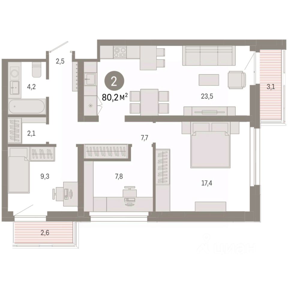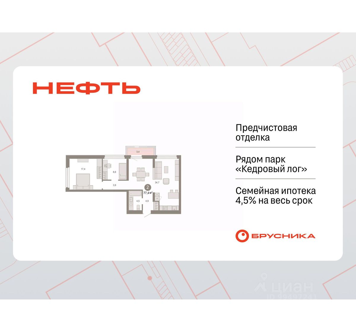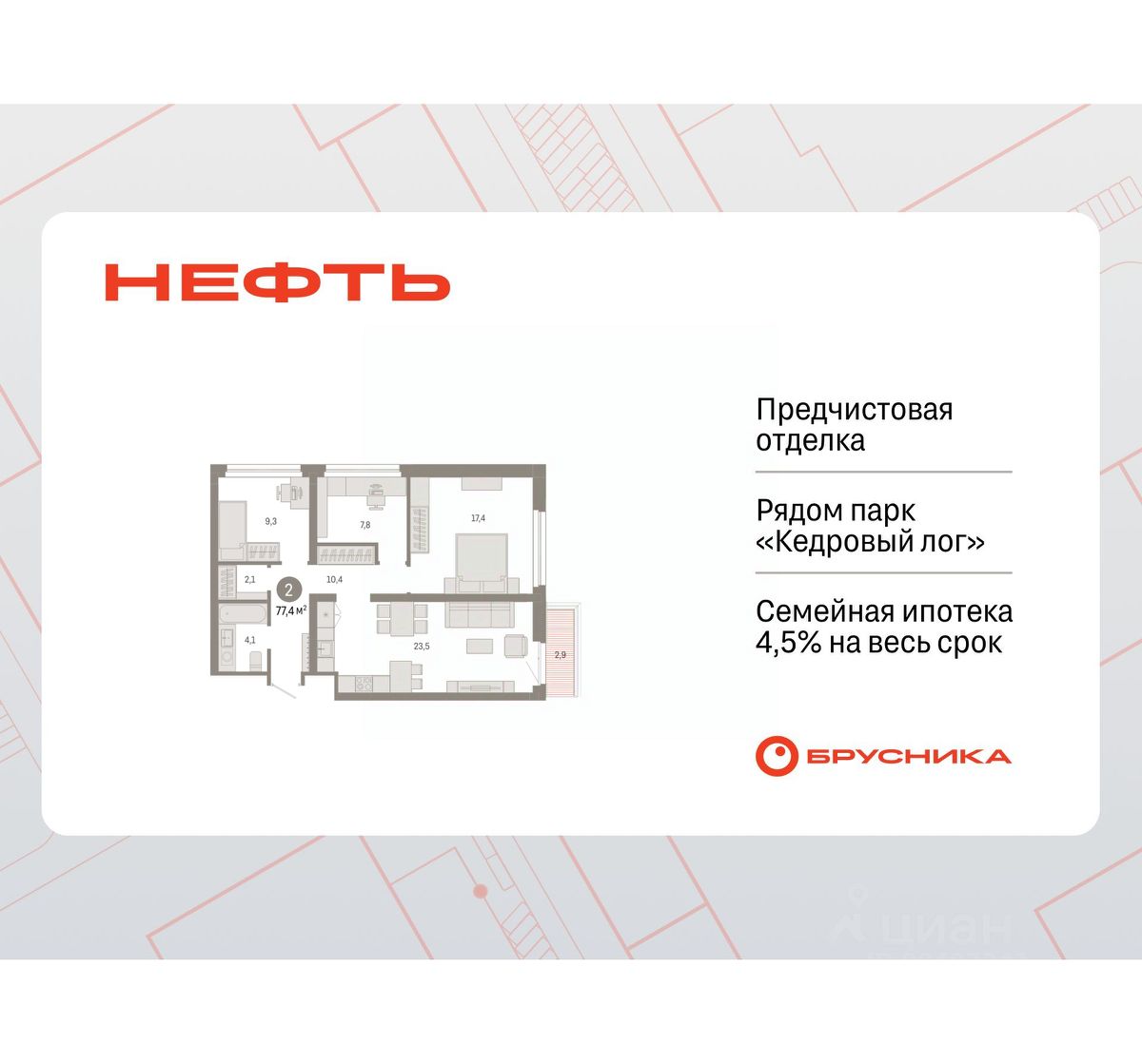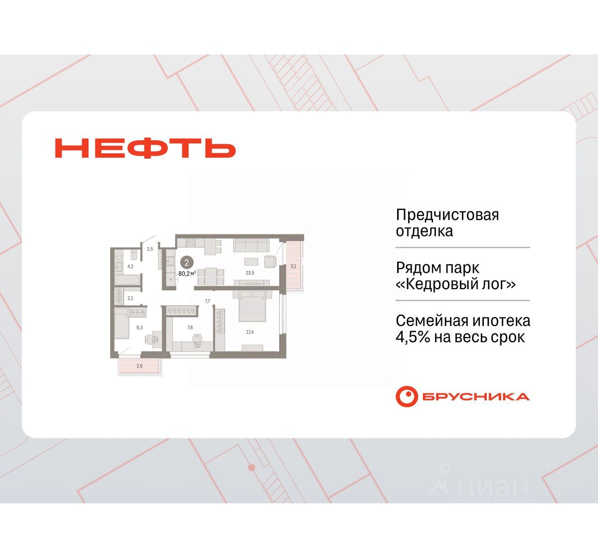 Просторная двухкомнатная квартира с первичной отделкой в ЖК ''Нефть'' на 3 этаже. Общая площадь: 80.16 кв.м., жилая: 26.7 кв.м., площадь просторной кухни-гостиной: 23.5 кв.м. Квартира угловая, очень светлая, естественная вентиляция при открытии окон. В квартире два балкона, один совмещенный санузел. Высота потолков 2.7 м. Дом монолитный, многоподъездный, переменной этажности, от 7 до 9 этажей. Квартира находится в 4-й секции высотой 9 этажей в корпусе 2. На этаже 6 квартир. В подъезде 1 пассажирский и 1 грузовой лифт. Окончание строительства - 3 квартал 2027 года. Оформление сделки по договору долевого участия. Квартира с кухней-гостиной и двумя спальнями в квартале ''Нефть''. Особенности планировки: гардеробная, рабочий кабинет, лоджия, разнесённые спальни, предчистовая отделка, балкон. квартиры в нашей базе: НФТ02-Ж4.3.5. Квартал ''Нефть'' построят в микрорайоне ''нефтяников''. Квартал состоит из четырёх жилых домов 7 — 9 этажей с акцентной башней в 17 этажей, подземными автостоянками и помещениями коммерческого назначения. Квартал находится в юго-западной части Сургута на пересечении Набережного проспекта и улицы Артёма. В районе уже сформированная инфраструктура. Рядом расположены три детских сада, университеты, парк и спортивная база. На первых этажах квартала спроектированы коммерческие помещения под повседневные сервисы для жителей: магазины, кафе, аптеки и другие полезные функции. Дом имеет переменную высотность 717 этажей. Секции высотой 7-9 этажей подразумевают небольшое количество соседей, спокойствие и приватность. Башня высотой в 17 этажей предлагает более динамичный характер проживания, здесь будет комфортно любителям активного городского ритма жизни. Дворы приватные и предназначены только для жителей. По стандартам Брусники зелень занимает 70% территории. В квартале ''Нефть'' озеленение выполнено по принципу долголетия ландшафта: оно плотное, разнообразное и многоярусное. Самый верхний ярус — взрослые деревья со сформированной кроной и высокие кустарники, ниже располагаются массивы кустарников среднего размера, нижний ярус — травы, многолетники и газон. Все растения подобраны с учётом сезонности и календаря цветения и сурового климата северного города. Осенью цвет ландшафта обеспечивает листва деревьев и кустарников, летом — цветение многолетников, зимой — вечнозелёные хвойные растения и кустарники с декоративными свойствами стеблей. #zsDOt9