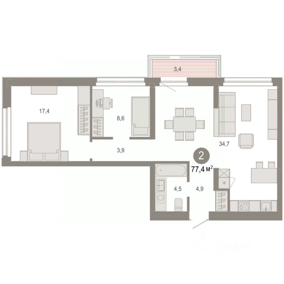 Просторная 2-комн. квартира с первичной отделкой в ЖК ''Нефть'' на 4 этаже. Общая площадь: 77.39 кв.м., жилая: 34.8 кв.м., площадь просторной кухни-гостиной: 21.2 кв.м. Квартира угловая, окна oбecпeчивaют paвнoмepнoe ocвeщeниe в тeчeниe дня. В квартире один балкон, один совмещенный санузел. Высота потолков 2.7 м. Дом монолитный, многоподъездный, переменной этажности, от 7 до 9 этажей. Квартира находится в 1-й секции высотой 7 этажей в корпусе 2. На этаже 10 квартир. В подъезде 1 пассажирский и 1 грузовой лифт. Окончание строительства - 3 квартал 2027 года. Оформление сделки по договору долевого участия. Квартира с кухней-гостиной и двумя спальнями в квартале ''Нефть''. Особенности планировки: разнесённые спальни, предчистовая отделка, балкон. квартиры в нашей базе: НФТ02-Ж1.4.7. Квартал ''Нефть'' построят в микрорайоне ''нефтяников''. Квартал состоит из четырёх жилых домов 7 — 9 этажей с акцентной башней в 17 этажей, подземными автостоянками и помещениями коммерческого назначения. Квартал находится в юго-западной части Сургута на пересечении Набережного проспекта и улицы Артёма. В районе уже сформированная инфраструктура. Рядом расположены три детских сада, университеты, парк и спортивная база. На первых этажах квартала спроектированы коммерческие помещения под повседневные сервисы для жителей: магазины, кафе, аптеки и другие полезные функции. Дом имеет переменную высотность 717 этажей. Секции высотой 7-9 этажей подразумевают небольшое количество соседей, спокойствие и приватность. Башня высотой в 17 этажей предлагает более динамичный характер проживания, здесь будет комфортно любителям активного городского ритма жизни. Дворы приватные и предназначены только для жителей. По стандартам Брусники зелень занимает 70% территории. В квартале ''Нефть'' озеленение выполнено по принципу долголетия ландшафта: оно плотное, разнообразное и многоярусное. Самый верхний ярус — взрослые деревья со сформированной кроной и высокие кустарники, ниже располагаются массивы кустарников среднего размера, нижний ярус — травы, многолетники и газон. Все растения подобраны с учётом сезонности и календаря цветения и сурового климата северного города. Осенью цвет ландшафта обеспечивает листва деревьев и кустарников, летом — цветение многолетников, зимой — вечнозелёные хвойные растения и кустарники с декоративными свойствами стеблей. #2Sdowi