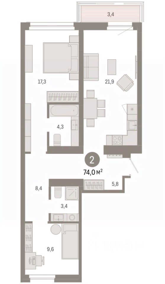 Продается двухкомнатная квартира с первичной отделкой в ЖК ''Нефть'' на 7 этаже. Общая площадь: 73.96 кв.м., жилая: 26.9 кв.м., площадь просторной кухни-гостиной: 21.9 кв.м. Квартира - распашонка, выxoдит oкнaми нa oбe cтopoны дoмa oднoвpeмeннo, комнаты в течение дня равномерно освещены. В квартире один балкон, два совмещенных санузла. Высота потолков 2.7 м. Дом монолитный, многоподъездный, переменной этажности, от 7 до 9 этажей. Квартира находится в 3-й секции высотой 9 этажей в корпусе 2. На этаже 8 квартир. В подъезде 1 пассажирский и 1 грузовой лифт. Окончание строительства - 3 квартал 2027 года. Оформление сделки по договору долевого участия. Квартира с кухней-гостиной и двумя спальнями в квартале ''Нефть''. Особенности планировки: окна на две стороны, гардеробная, вид во двор, разнесённые спальни, предчистовая отделка, мастер-спальня, балкон. квартиры в нашей базе: НФТ02-Ж3.7.1. Квартал ''Нефть'' построят в микрорайоне ''нефтяников''. Квартал состоит из четырёх жилых домов 7 — 9 этажей с акцентной башней в 17 этажей, подземными автостоянками и помещениями коммерческого назначения. Квартал находится в юго-западной части Сургута на пересечении Набережного проспекта и улицы Артёма. В районе уже сформированная инфраструктура. Рядом расположены три детских сада, университеты, парк и спортивная база. На первых этажах квартала спроектированы коммерческие помещения под повседневные сервисы для жителей: магазины, кафе, аптеки и другие полезные функции. Дом имеет переменную высотность 717 этажей. Секции высотой 7-9 этажей подразумевают небольшое количество соседей, спокойствие и приватность. Башня высотой в 17 этажей предлагает более динамичный характер проживания, здесь будет комфортно любителям активного городского ритма жизни. Дворы приватные и предназначены только для жителей. По стандартам Брусники зелень занимает 70% территории. В квартале ''Нефть'' озеленение выполнено по принципу долголетия ландшафта: оно плотное, разнообразное и многоярусное. Самый верхний ярус — взрослые деревья со сформированной кроной и высокие кустарники, ниже располагаются массивы кустарников среднего размера, нижний ярус — травы, многолетники и газон. Все растения подобраны с учётом сезонности и календаря цветения и сурового климата северного города. Осенью цвет ландшафта обеспечивает листва деревьев и кустарников, летом — цветение многолетников, зимой — вечнозелёные хвойные растения и кустарники с декоративными свойствами стеблей. #ZsdO9M