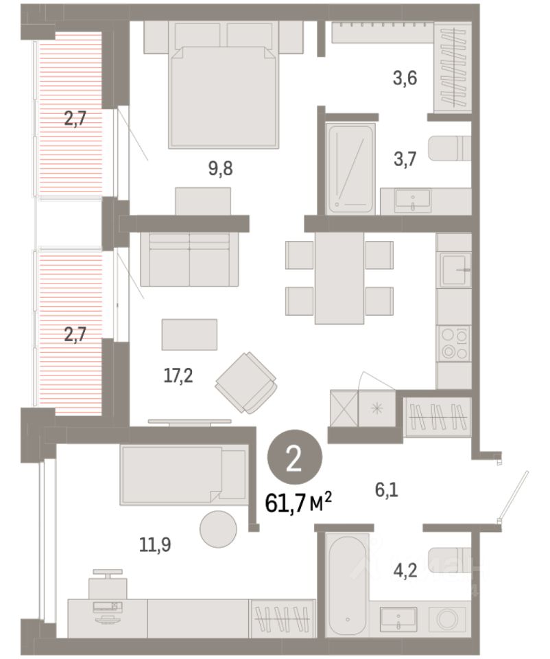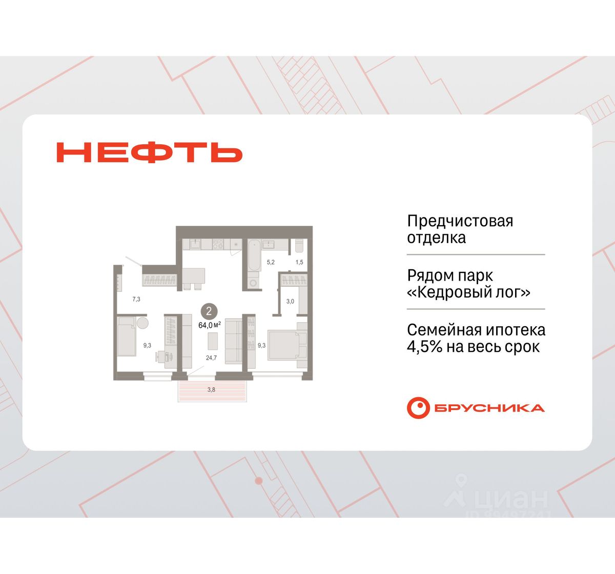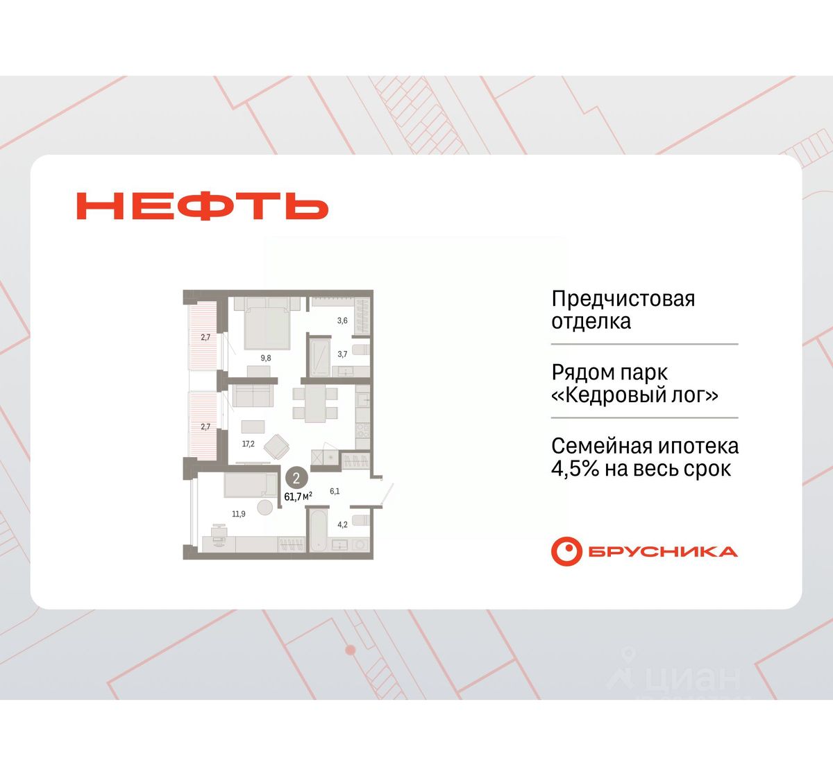 2-комн. квартира с первичной отделкой в ЖК ''Нефть'' на 9 этаже. Общая площадь: 61.68 кв.м., жилая: 21.7 кв.м., площадь просторной кухни-гостиной: 17.2 кв.м. Комнаты изолированные, все окна выходят на одну сторону. В квартире две лоджии, два совмещенных санузла. Высота потолков 2.7 м. Дом монолитный, многоподъездный, переменной этажности, от 7 до 9 этажей. Квартира находится в 6-й секции высотой 9 этажей в корпусе 2. На этаже 5 квартир. В подъезде 1 пассажирский и 1 грузовой лифт. Окончание строительства - 3 квартал 2027 года. Оформление сделки по договору долевого участия. Квартира с кухней-гостиной и двумя спальнями в квартале ''Нефть''. Особенности планировки: гардеробная, окна в пол, лоджия, разнесённые спальни, предчистовая отделка, мастер-спальня. квартиры в нашей базе: НФТ02-Ж6.9.3. Квартал ''Нефть'' построят в микрорайоне ''нефтяников''. Квартал состоит из четырёх жилых домов 7 — 9 этажей с акцентной башней в 17 этажей, подземными автостоянками и помещениями коммерческого назначения. Квартал находится в юго-западной части Сургута на пересечении Набережного проспекта и улицы Артёма. В районе уже сформированная инфраструктура. Рядом расположены три детских сада, университеты, парк и спортивная база. На первых этажах квартала спроектированы коммерческие помещения под повседневные сервисы для жителей: магазины, кафе, аптеки и другие полезные функции. Дом имеет переменную высотность 717 этажей. Секции высотой 7-9 этажей подразумевают небольшое количество соседей, спокойствие и приватность. Башня высотой в 17 этажей предлагает более динамичный характер проживания, здесь будет комфортно любителям активного городского ритма жизни. Дворы приватные и предназначены только для жителей. По стандартам Брусники зелень занимает 70% территории. В квартале ''Нефть'' озеленение выполнено по принципу долголетия ландшафта: оно плотное, разнообразное и многоярусное. Самый верхний ярус — взрослые деревья со сформированной кроной и высокие кустарники, ниже располагаются массивы кустарников среднего размера, нижний ярус — травы, многолетники и газон. Все растения подобраны с учётом сезонности и календаря цветения и сурового климата северного города. Осенью цвет ландшафта обеспечивает листва деревьев и кустарников, летом — цветение многолетников, зимой — вечнозелёные хвойные растения и кустарники с декоративными свойствами стеблей. #Z5doav