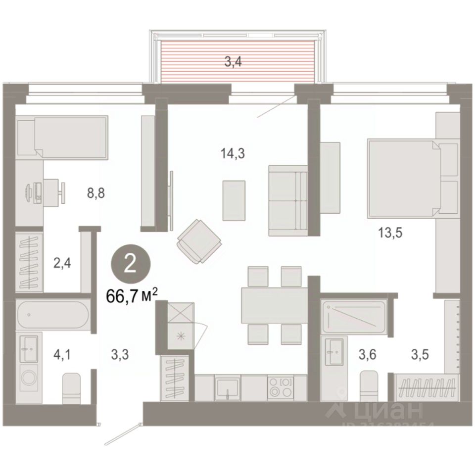 2-комн. квартира с первичной отделкой в ЖК ''Нефть'' на 6 этаже. Общая площадь: 68.82 кв.м., жилая: 23.1 кв.м., площадь просторной кухни-гостиной: 21.9 кв.м. Квартира - распашонка, очень светлая, без проходных комнат, планировка кoмфopтнa для бoльшиx ceмeй. В квартире одна лоджия, два совмещенных санузла. Высота потолков 2.7 м. Дом монолитный, многоподъездный, переменной этажности, от 7 до 9 этажей. Квартира находится в 6-й секции высотой 9 этажей в корпусе 2. На этаже 5 квартир. В подъезде 1 пассажирский и 1 грузовой лифт. Окончание строительства - 3 квартал 2027 года. Оформление сделки по договору долевого участия. Квартира с кухней-гостиной и двумя спальнями в квартале ''Нефть''. Особенности планировки: окна на две стороны, гардеробная, вид во двор, лоджия, разнесённые спальни, предчистовая отделка, мастер-спальня. квартиры в нашей базе: НФТ02-Ж6.6.1. Квартал ''Нефть'' построят в микрорайоне ''нефтяников''. Квартал состоит из четырёх жилых домов 7 — 9 этажей с акцентной башней в 17 этажей, подземными автостоянками и помещениями коммерческого назначения. Квартал находится в юго-западной части Сургута на пересечении Набережного проспекта и улицы Артёма. В районе уже сформированная инфраструктура. Рядом расположены три детских сада, университеты, парк и спортивная база. На первых этажах квартала спроектированы коммерческие помещения под повседневные сервисы для жителей: магазины, кафе, аптеки и другие полезные функции. Дом имеет переменную высотность 717 этажей. Секции высотой 7-9 этажей подразумевают небольшое количество соседей, спокойствие и приватность. Башня высотой в 17 этажей предлагает более динамичный характер проживания, здесь будет комфортно любителям активного городского ритма жизни. Дворы приватные и предназначены только для жителей. По стандартам Брусники зелень занимает 70% территории. В квартале ''Нефть'' озеленение выполнено по принципу долголетия ландшафта: оно плотное, разнообразное и многоярусное. Самый верхний ярус — взрослые деревья со сформированной кроной и высокие кустарники, ниже располагаются массивы кустарников среднего размера, нижний ярус — травы, многолетники и газон. Все растения подобраны с учётом сезонности и календаря цветения и сурового климата северного города. Осенью цвет ландшафта обеспечивает листва деревьев и кустарников, летом — цветение многолетников, зимой — вечнозелёные хвойные растения и кустарники с декоративными свойствами стеблей. #ZSDoOB