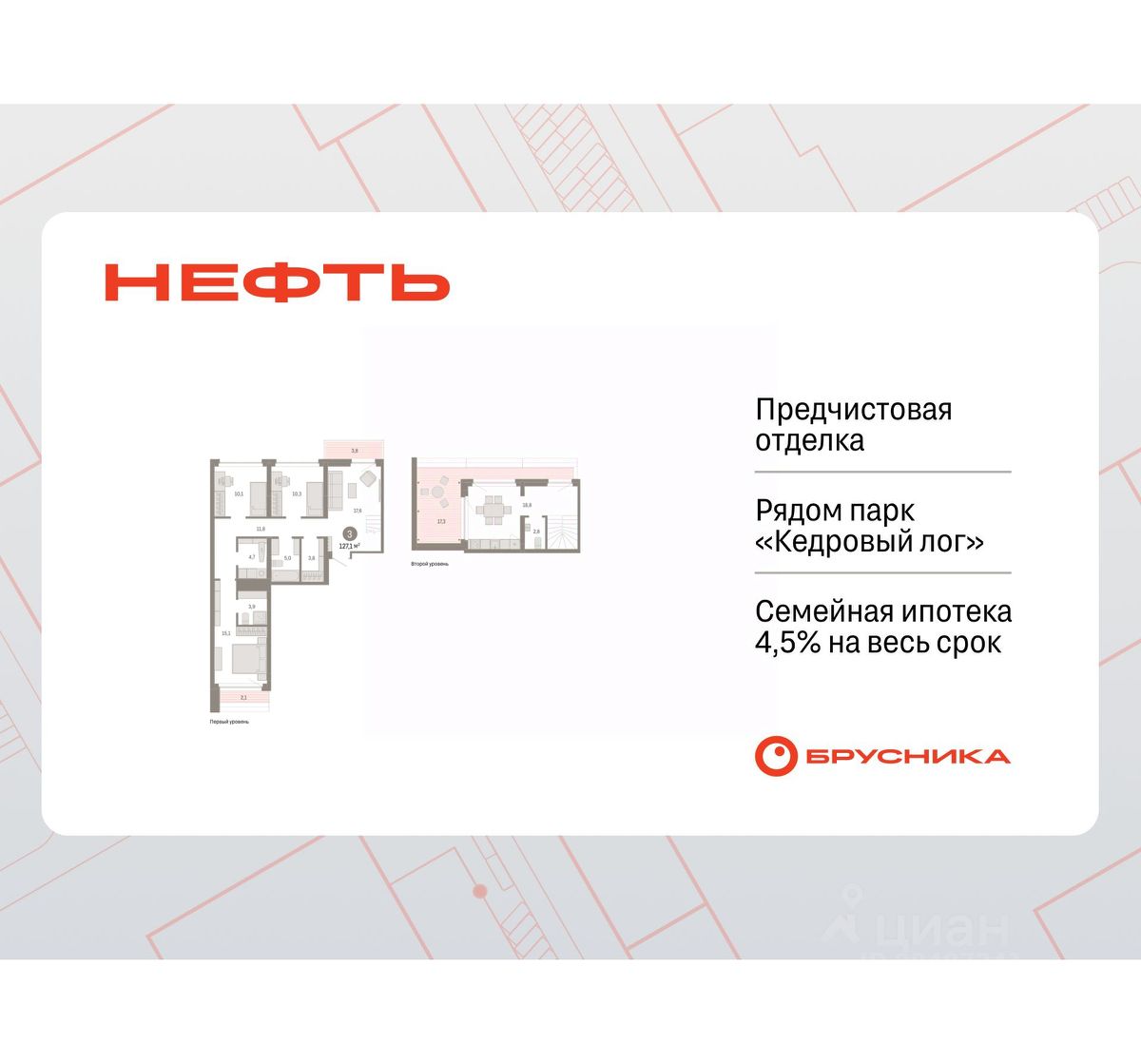 3-комн. квартира от застройщика с первичной отделкой в ЖК ''Нефть'' на 7 этаже. Двухуровневая квартира, большая площадь и простор для воплощения дизайнерских идей. Общая площадь: 127.11 кв.м., жилая: 38.2 кв.м., площадь просторной кухни-гостиной: 19.8 кв.м. Квартира - распашонка, без проходных комнат, окна выходят на paзные стороны дома. В квартире два балкона и одна лоджия, два совмещенных и один раздельный санузел. Наличие в квартире террасы открывает возможность для создания зон отдыха в кругу семьи и друзей. Высота потолков 2.7 м. Дом монолитный, многоподъездный, переменной этажности, от 7 до 9 этажей. Квартира находится в 5-й секции высотой 7 этажей в корпусе 2. На этаже 5 квартир. В подъезде 1 пассажирский и 1 грузовой лифт. Окончание строительства - 3 квартал 2027 года. Оформление сделки по договору долевого участия. Двухуровневая квартира с кухней-гостиной и тремя спальнями в квартале ''Нефть''. Особенности планировки: окна на две стороны, двухуровневая, вид во двор, свободная планировка, балкон, терраса на крыше. квартиры в нашей базе: НФТ02-Ж5.7.4. Квартал ''Нефть'' построят в микрорайоне ''нефтяников''. Квартал состоит из четырёх жилых домов 7 — 9 этажей с акцентной башней в 17 этажей, подземными автостоянками и помещениями коммерческого назначения. Квартал находится в юго-западной части Сургута на пересечении Набережного проспекта и улицы Артёма. В районе уже сформированная инфраструктура. Рядом расположены три детских сада, университеты, парк и спортивная база. На первых этажах квартала спроектированы коммерческие помещения под повседневные сервисы для жителей: магазины, кафе, аптеки и другие полезные функции. Дом имеет переменную высотность 717 этажей. Секции высотой 7-9 этажей подразумевают небольшое количество соседей, спокойствие и приватность. Башня высотой в 17 этажей предлагает более динамичный характер проживания, здесь будет комфортно любителям активного городского ритма жизни. Дворы приватные и предназначены только для жителей. По стандартам Брусники зелень занимает 70% территории. В квартале ''Нефть'' озеленение выполнено по принципу долголетия ландшафта: оно плотное, разнообразное и многоярусное. Самый верхний ярус — взрослые деревья со сформированной кроной и высокие кустарники, ниже располагаются массивы кустарников среднего размера, нижний ярус — травы, многолетники и газон. Все растения подобраны с учётом сезонности и календаря цветения и сурового климата северного города. Осенью цвет ландшафта обеспечивает листва деревьев и кустарников, летом — цветение многолетников, зимой — вечнозелёные хвойные растения и кустарники с декоративными свойствами стеблей. #zSdolF