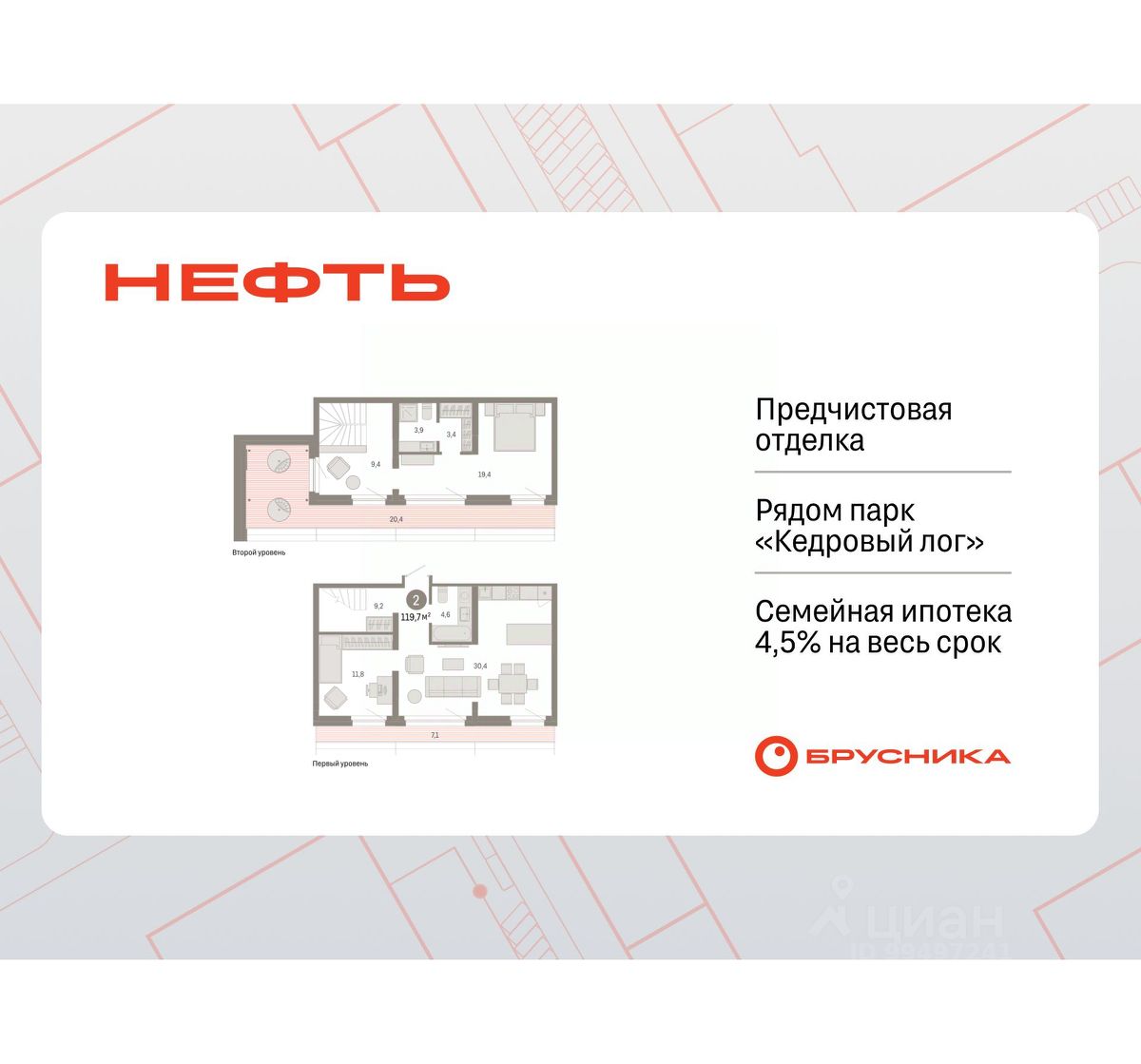 2-комн. квартира с первичной отделкой в ЖК ''Нефть'' на 7 этаже. Двухуровневая квартира, множество вариантов распределения полезного пространства. Общая площадь: 119.72 кв.м., жилая: 31.2 кв.м., площадь просторной кухни-гостиной: 30.4 кв.м. Комнаты изолированные, все окна выходят на одну сторону. В квартире два балкона, два совмещенных санузла. Наличие в квартире террасы дает возможность для создания зон отдыха в кругу семьи и друзей. Высота потолков 2.7 м. Дом монолитный, многоподъездный, переменной этажности, от 7 до 9 этажей. Квартира находится в 5-й секции высотой 7 этажей в корпусе 2. На этаже 5 квартир. В подъезде 1 пассажирский и 1 грузовой лифт. Окончание строительства - 3 квартал 2027 года. Оформление сделки по договору долевого участия. Двухуровневая квартира с кухней-гостиной и двумя спальнями в квартале ''Нефть''. Особенности планировки: двухуровневая, свободная планировка, терраса на крыше. квартиры в нашей базе: НФТ02-Ж5.7.3. Квартал ''Нефть'' построят в микрорайоне ''нефтяников''. Квартал состоит из четырёх жилых домов 7 — 9 этажей с акцентной башней в 17 этажей, подземными автостоянками и помещениями коммерческого назначения. Квартал находится в юго-западной части Сургута на пересечении Набережного проспекта и улицы Артёма. В районе уже сформированная инфраструктура. Рядом расположены три детских сада, университеты, парк и спортивная база. На первых этажах квартала спроектированы коммерческие помещения под повседневные сервисы для жителей: магазины, кафе, аптеки и другие полезные функции. Дом имеет переменную высотность 717 этажей. Секции высотой 7-9 этажей подразумевают небольшое количество соседей, спокойствие и приватность. Башня высотой в 17 этажей предлагает более динамичный характер проживания, здесь будет комфортно любителям активного городского ритма жизни. Дворы приватные и предназначены только для жителей. По стандартам Брусники зелень занимает 70% территории. В квартале ''Нефть'' озеленение выполнено по принципу долголетия ландшафта: оно плотное, разнообразное и многоярусное. Самый верхний ярус — взрослые деревья со сформированной кроной и высокие кустарники, ниже располагаются массивы кустарников среднего размера, нижний ярус — травы, многолетники и газон. Все растения подобраны с учётом сезонности и календаря цветения и сурового климата северного города. Осенью цвет ландшафта обеспечивает листва деревьев и кустарников, летом — цветение многолетников, зимой — вечнозелёные хвойные растения и кустарники с декоративными свойствами стеблей. #2sDOzA