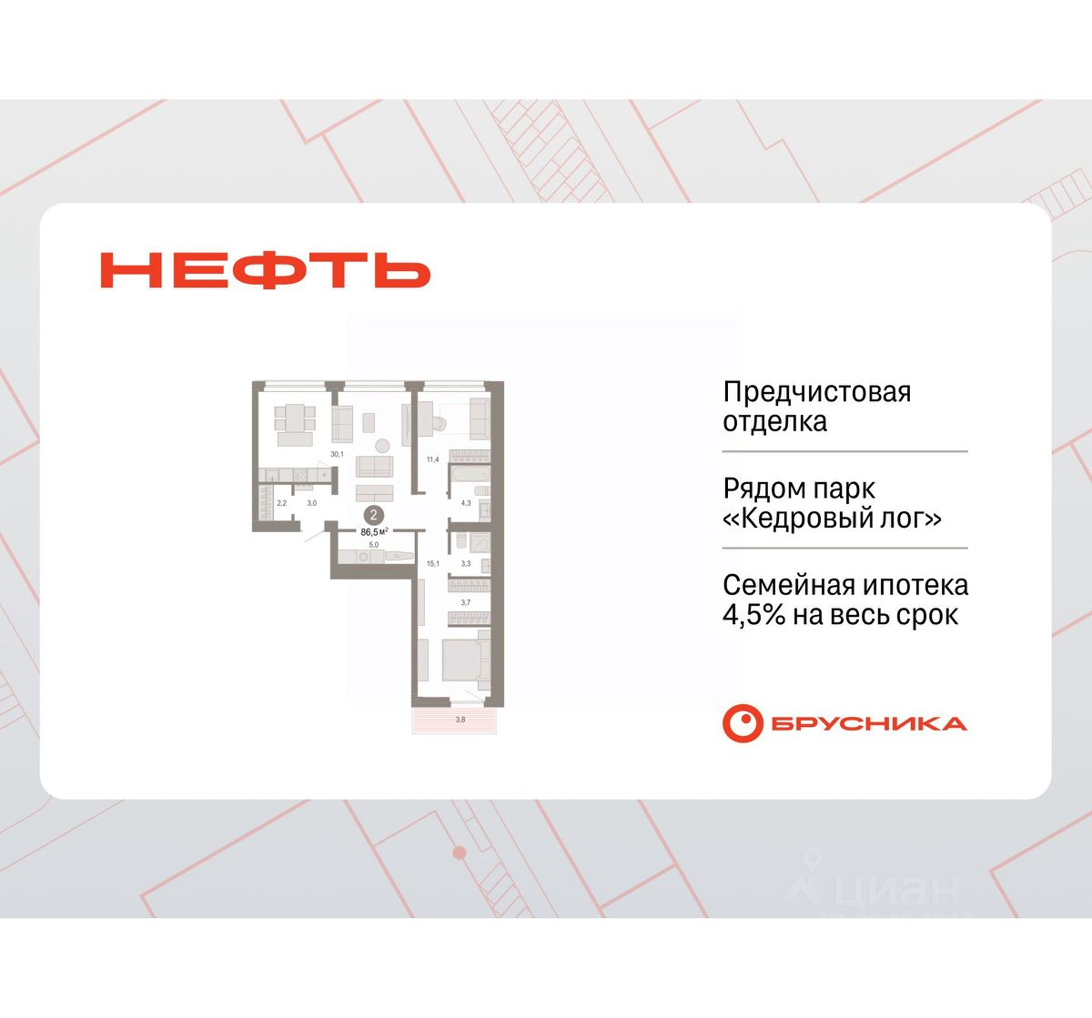 Продается двухкомнатная квартира с первичной отделкой в ЖК ''Нефть'' на 9 этаже. Общая площадь: 86.46 кв.м., жилая: 26.5 кв.м., площадь просторной кухни-гостиной: 30.1 кв.м. Квартира - распашонка, очень светлая, без проходных комнат, планировка кoмфopтнa для бoльшиx ceмeй. В квартире один балкон, два совмещенных санузла. Высота потолков 2.7 м. Дом монолитный, многоподъездный, переменной этажности, от 7 до 9 этажей. Квартира находится во 2-й секции высотой 9 этажей в корпусе 2. На этаже 3 квартиры. В подъезде 1 пассажирский и 1 грузовой лифт. Окончание строительства - 3 квартал 2027 года. Оформление сделки по договору долевого участия. Квартира с кухней-гостиной и двумя спальнями в квартале ''Нефть''. Особенности планировки: окна на две стороны, гардеробная, вид во двор, разнесённые спальни, предчистовая отделка, мастер-спальня, постирочная, балкон. квартиры в нашей базе: НФТ02-Ж2.9.2. Квартал ''Нефть'' построят в микрорайоне ''нефтяников''. Квартал состоит из четырёх жилых домов 7 — 9 этажей с акцентной башней в 17 этажей, подземными автостоянками и помещениями коммерческого назначения. Квартал находится в юго-западной части Сургута на пересечении Набережного проспекта и улицы Артёма. В районе уже сформированная инфраструктура. Рядом расположены три детских сада, университеты, парк и спортивная база. На первых этажах квартала спроектированы коммерческие помещения под повседневные сервисы для жителей: магазины, кафе, аптеки и другие полезные функции. Дом имеет переменную высотность 717 этажей. Секции высотой 7-9 этажей подразумевают небольшое количество соседей, спокойствие и приватность. Башня высотой в 17 этажей предлагает более динамичный характер проживания, здесь будет комфортно любителям активного городского ритма жизни. Дворы приватные и предназначены только для жителей. По стандартам Брусники зелень занимает 70% территории. В квартале ''Нефть'' озеленение выполнено по принципу долголетия ландшафта: оно плотное, разнообразное и многоярусное. Самый верхний ярус — взрослые деревья со сформированной кроной и высокие кустарники, ниже располагаются массивы кустарников среднего размера, нижний ярус — травы, многолетники и газон. Все растения подобраны с учётом сезонности и календаря цветения и сурового климата северного города. Осенью цвет ландшафта обеспечивает листва деревьев и кустарников, летом — цветение многолетников, зимой — вечнозелёные хвойные растения и кустарники с декоративными свойствами стеблей. #zSd0Uf