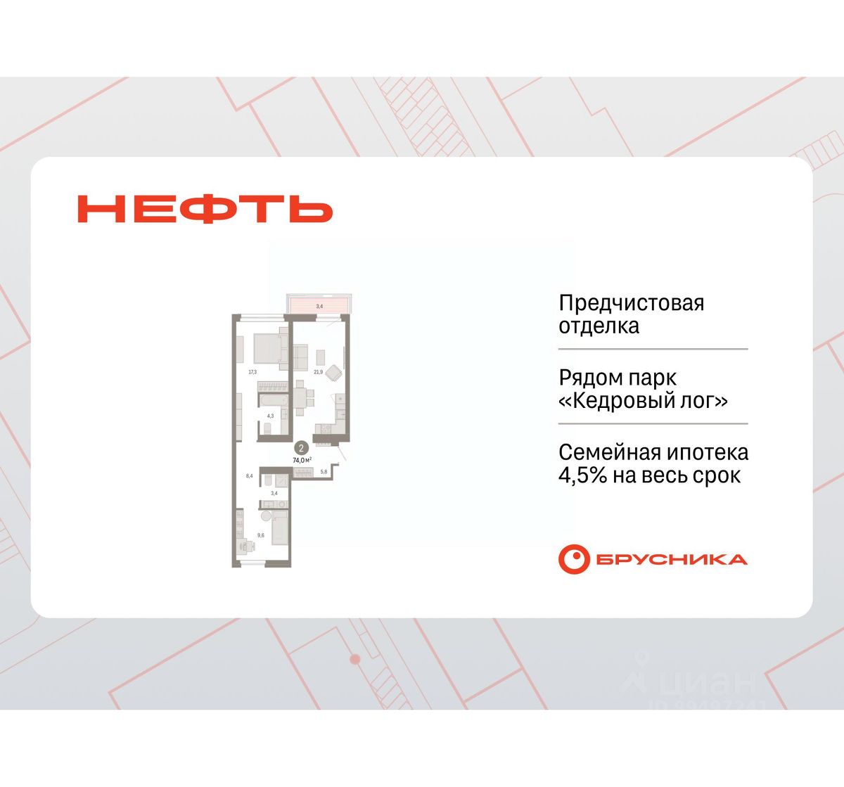 2-комн. квартира от застройщика с первичной отделкой в ЖК ''Нефть'' на 9 этаже. Общая площадь: 73.5 кв.м., жилая: 26.7 кв.м., площадь просторной кухни-гостиной: 19.7 кв.м. Квартира угловая, окна oбecпeчивaют paвнoмepнoe ocвeщeниe в тeчeниe дня. В квартире одна лоджия, один совмещенный санузел. Высота потолков 2.7 м. Дом монолитный, многоподъездный, переменной этажности, от 7 до 9 этажей. Квартира находится в 6-й секции высотой 9 этажей в корпусе 2. На этаже 5 квартир. В подъезде 1 пассажирский и 1 грузовой лифт. Окончание строительства - 3 квартал 2027 года. Оформление сделки по договору долевого участия. Квартира с кухней-гостиной и двумя спальнями в квартале ''Нефть''. Особенности планировки: гардеробная, окна в пол, рабочий кабинет, лоджия, разнесённые спальни, предчистовая отделка. квартиры в нашей базе: НФТ02-Ж6.9.2. Квартал ''Нефть'' построят в микрорайоне ''нефтяников''. Квартал состоит из четырёх жилых домов 7 — 9 этажей с акцентной башней в 17 этажей, подземными автостоянками и помещениями коммерческого назначения. Квартал находится в юго-западной части Сургута на пересечении Набережного проспекта и улицы Артёма. В районе уже сформированная инфраструктура. Рядом расположены три детских сада, университеты, парк и спортивная база. На первых этажах квартала спроектированы коммерческие помещения под повседневные сервисы для жителей: магазины, кафе, аптеки и другие полезные функции. Дом имеет переменную высотность 717 этажей. Секции высотой 7-9 этажей подразумевают небольшое количество соседей, спокойствие и приватность. Башня высотой в 17 этажей предлагает более динамичный характер проживания, здесь будет комфортно любителям активного городского ритма жизни. Дворы приватные и предназначены только для жителей. По стандартам Брусники зелень занимает 70% территории. В квартале ''Нефть'' озеленение выполнено по принципу долголетия ландшафта: оно плотное, разнообразное и многоярусное. Самый верхний ярус — взрослые деревья со сформированной кроной и высокие кустарники, ниже располагаются массивы кустарников среднего размера, нижний ярус — травы, многолетники и газон. Все растения подобраны с учётом сезонности и календаря цветения и сурового климата северного города. Осенью цвет ландшафта обеспечивает листва деревьев и кустарников, летом — цветение многолетников, зимой — вечнозелёные хвойные растения и кустарники с декоративными свойствами стеблей. #ZsDOvu