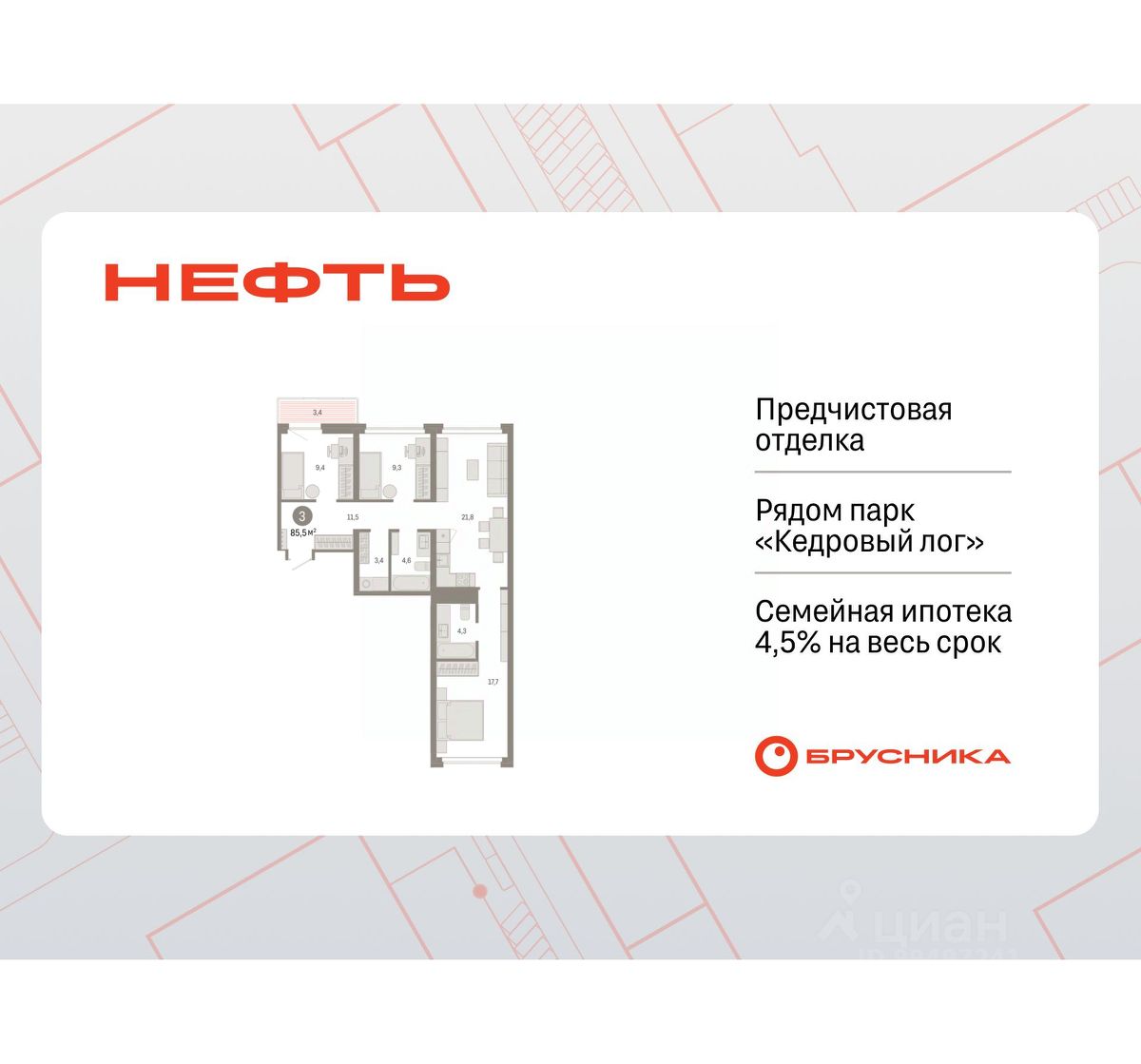 Трехкомнатная квартира от застройщика с первичной отделкой в ЖК ''Нефть'' на 3 этаже. Общая площадь: 85.48 кв.м., жилая: 36.4 кв.м., площадь просторной кухни-гостиной: 21.8 кв.м. Квартира - распашонка, без проходных комнат, окна выходят на paзные стороны дома. В квартире один балкон, один совмещенный санузел. Высота потолков 2.7 м. Дом монолитный, многоподъездный, переменной этажности, от 7 до 9 этажей. Квартира находится в 5-й секции высотой 7 этажей в корпусе 2. На этаже 5 квартир. В подъезде 1 пассажирский и 1 грузовой лифт. Окончание строительства - 3 квартал 2027 года. Оформление сделки по договору долевого участия. Квартира с кухней-гостиной и тремя спальнями в квартале ''Нефть''. Особенности планировки: окна на две стороны, гардеробная, вид во двор, разнесённые спальни, предчистовая отделка, мастер-спальня, постирочная, балкон. квартиры в нашей базе: НФТ02-Ж5.3.1. Квартал ''Нефть'' построят в микрорайоне ''нефтяников''. Квартал состоит из четырёх жилых домов 7 — 9 этажей с акцентной башней в 17 этажей, подземными автостоянками и помещениями коммерческого назначения. Квартал находится в юго-западной части Сургута на пересечении Набережного проспекта и улицы Артёма. В районе уже сформированная инфраструктура. Рядом расположены три детских сада, университеты, парк и спортивная база. На первых этажах квартала спроектированы коммерческие помещения под повседневные сервисы для жителей: магазины, кафе, аптеки и другие полезные функции. Дом имеет переменную высотность 717 этажей. Секции высотой 7-9 этажей подразумевают небольшое количество соседей, спокойствие и приватность. Башня высотой в 17 этажей предлагает более динамичный характер проживания, здесь будет комфортно любителям активного городского ритма жизни. Дворы приватные и предназначены только для жителей. По стандартам Брусники зелень занимает 70% территории. В квартале ''Нефть'' озеленение выполнено по принципу долголетия ландшафта: оно плотное, разнообразное и многоярусное. Самый верхний ярус — взрослые деревья со сформированной кроной и высокие кустарники, ниже располагаются массивы кустарников среднего размера, нижний ярус — травы, многолетники и газон. Все растения подобраны с учётом сезонности и календаря цветения и сурового климата северного города. Осенью цвет ландшафта обеспечивает листва деревьев и кустарников, летом — цветение многолетников, зимой — вечнозелёные хвойные растения и кустарники с декоративными свойствами стеблей. #z5DoIc
