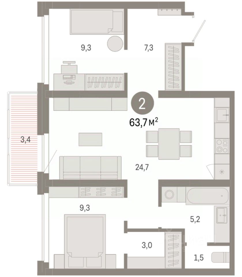 Просторная двухкомнатная квартира с предчистовой отделкой в ЖК ''Нефть'' на 8 этаже. Общая площадь: 63.73 кв.м., жилая: 18.6 кв.м., площадь просторной кухни-гостиной: 24.7 кв.м. Комнаты изолированные, все окна выходят на одну сторону. В квартире один балкон, один совмещенный санузел. Высота потолков 2.7 м. Дом монолитный, многоподъездный, переменной этажности, от 7 до 9 этажей. Квартира находится в 3-й секции высотой 9 этажей в корпусе 2. На этаже 8 квартир. В подъезде 1 пассажирский и 1 грузовой лифт. Окончание строительства - 3 квартал 2027 года. Оформление сделки по договору долевого участия. Квартира с кухней-гостиной и двумя спальнями в квартале ''Нефть''. Особенности планировки: балкон, предчистовая отделка, разнесённые спальни. квартиры в нашей базе: НФТ02-Ж3.8.7. Квартал ''Нефть'' построят в микрорайоне ''нефтяников''. Квартал состоит из четырёх жилых домов 7 — 9 этажей с акцентной башней в 17 этажей, подземными автостоянками и помещениями коммерческого назначения. Квартал находится в юго-западной части Сургута на пересечении Набережного проспекта и улицы Артёма. В районе уже сформированная инфраструктура. Рядом расположены три детских сада, университеты, парк и спортивная база. На первых этажах квартала спроектированы коммерческие помещения под повседневные сервисы для жителей: магазины, кафе, аптеки и другие полезные функции. Дом имеет переменную высотность 717 этажей. Секции высотой 7-9 этажей подразумевают небольшое количество соседей, спокойствие и приватность. Башня высотой в 17 этажей предлагает более динамичный характер проживания, здесь будет комфортно любителям активного городского ритма жизни. Дворы приватные и предназначены только для жителей. По стандартам Брусники зелень занимает 70% территории. В квартале ''Нефть'' озеленение выполнено по принципу долголетия ландшафта: оно плотное, разнообразное и многоярусное. Самый верхний ярус — взрослые деревья со сформированной кроной и высокие кустарники, ниже располагаются массивы кустарников среднего размера, нижний ярус — травы, многолетники и газон. Все растения подобраны с учётом сезонности и календаря цветения и сурового климата северного города. Осенью цвет ландшафта обеспечивает листва деревьев и кустарников, летом — цветение многолетников, зимой — вечнозелёные хвойные растения и кустарники с декоративными свойствами стеблей. #ZMAMtB