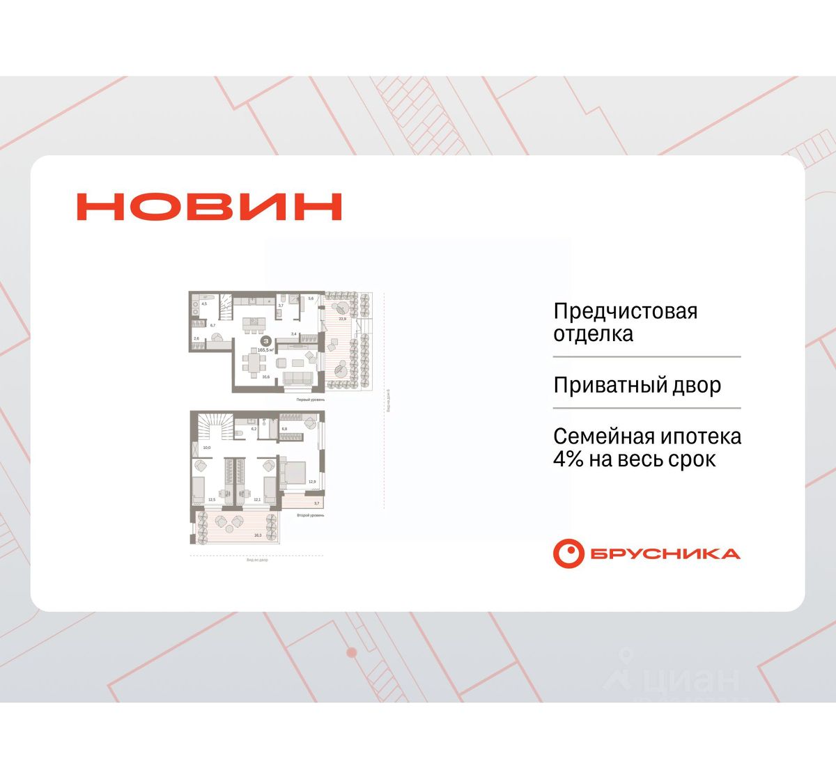 3-комн. квартира от застройщика с предчистовой отделкой в ЖК ''Новин'' на 1 этаже. Двухуровневая квартира с возможностью разделения гостевой зоны и личного пространства. Общая площадь: 165.47 кв.м., жилая: 37.5 кв.м., площадь просторной кухни-гостиной: 35.6 кв.м. Квартира угловая, очень светлая, естественная вентиляция при открытии окон. В квартире три балкона, два совмещенных санузла. Терраса площадью 22.9 кв.м. представляет собой роскошную зону отдыха, где вы на свой вкус можете создать атмосферу комфорта и уюта. Высота потолков 2.74 м.