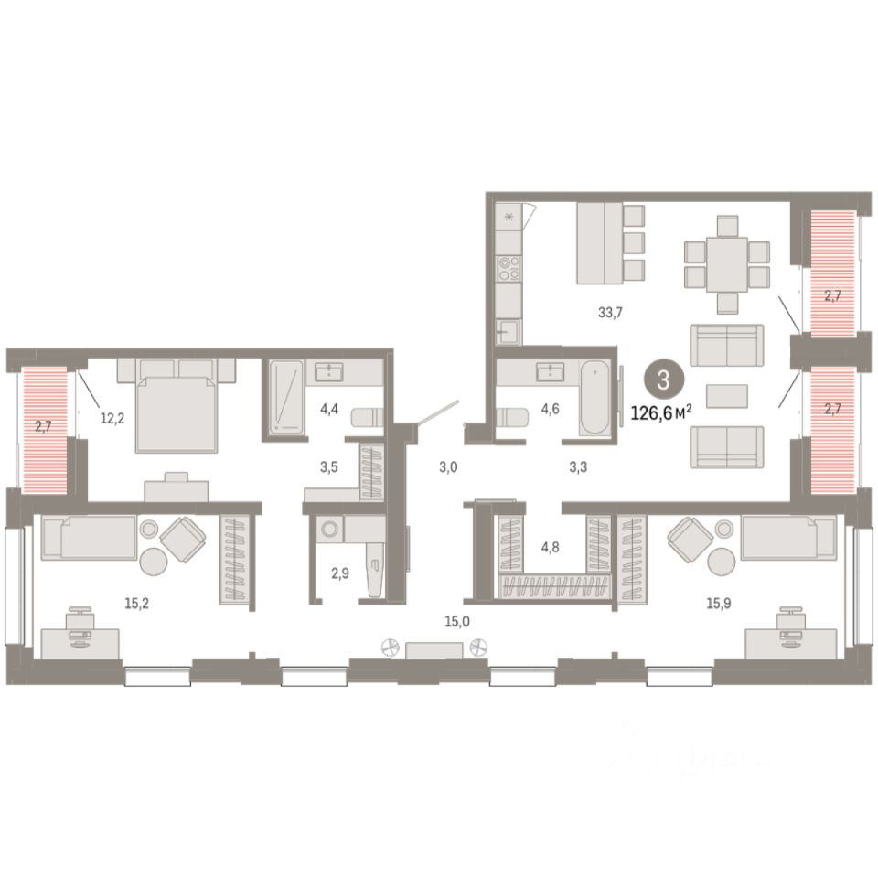 Квартира с кухней-гостиной и тремя спальнями в квартале ''Нефть''. Особенности планировки: окно в коридоре, гардеробная, окна в пол, вид во двор, лоджия, разнесённые спальни, предчистовая отделка, мастер-спальня, постирочная. квартиры в нашей базе: НФТ01-Ж3.16.4.