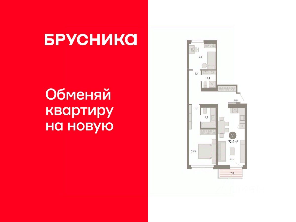 Квартира с кухней-гостиной и двумя спальнями в квартале ''Нефть''. Особенности планировки: балкон, окна на две стороны, предчистовая отделка, разнесённые спальни. квартиры в нашей базе: НФТ02-Ж4.8.6.