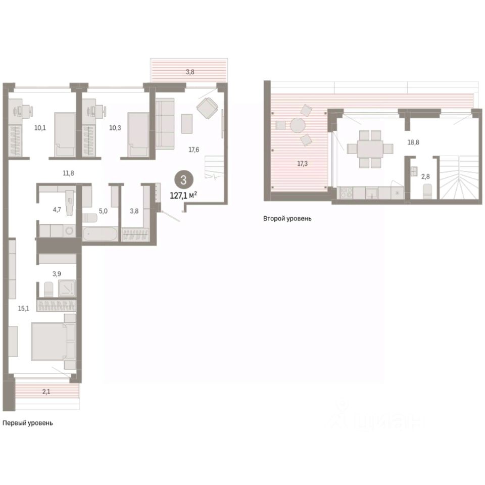 Двухуровневая квартира с кухней-гостиной и тремя спальнями в квартале ''Нефть''. Особенности планировки: двухуровневая, окна на две стороны, свободная планировка. квартиры в нашей базе: НФТ02-Ж5.7.4.