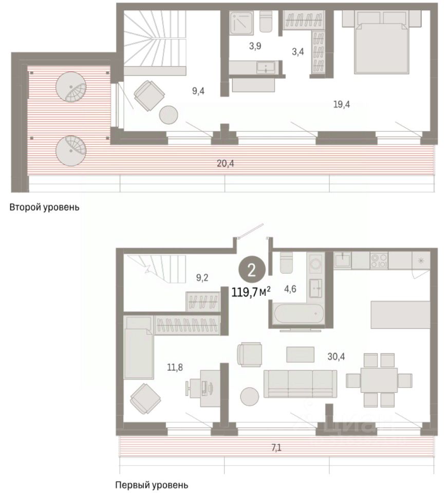 Двухуровневая квартира с кухней-гостиной и двумя спальнями в квартале ''Нефть''. Особенности планировки: двухуровневая, свободная планировка, терраса на крыше. квартиры в нашей базе: НФТ02-Ж5.7.3.