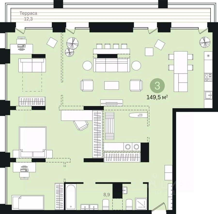 Просторная 3-комн. квартира с предчистовой отделкой в ЖК ''Гудзон'' на 8 этаже. Общая площадь: 149.45 кв.м., жилая: 65 кв.м., площадь просторной кухни-гостиной: 35 кв.м. Квартира угловая, очень светлая, естественная вентиляция при открытии окон. В квартире один балкон, два совмещенных санузла. Терраса размером 12.3 кв.м. представляет собой роскошную зону отдыха для проведение вечеров в кругу семьи и друзей или организация вечеринок. Высота потолков 2.72 м.