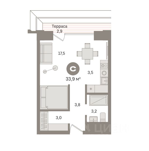 Центральное расположение, монолитный дом, восьмой этаж из 17, общая площадь 33.9 м², жилая 17.5 м². Ремонт — чистовая, состояние — хорошее. Потолки 2.70 м. Вид из окна — на улицу. Балкон. Совмещённый санузел. Лифты пассажирский и грузовой. Год постройки: 2025. Доля в квартире: Нет.