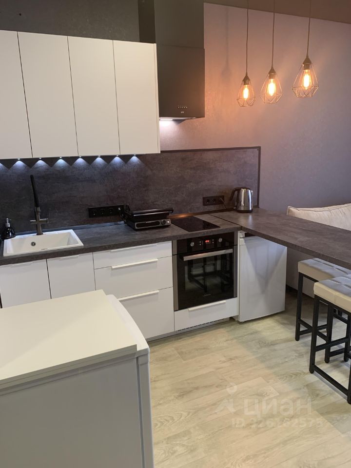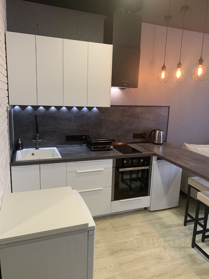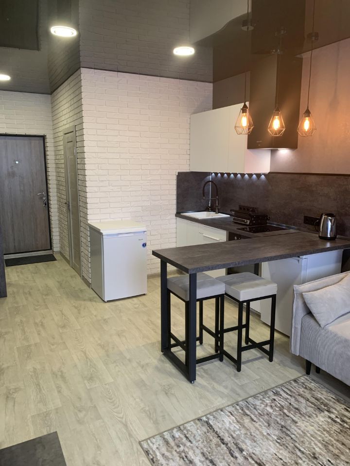 Кухня оборудована техникой: варочная панель, духовой шкаф, холодильник, морозильная камера под барной стойкой, вытяжка. В совмещенном санузле установлена стильная сантехника и качественная отделка, так же установлен водонагреватель и стиральная машина.