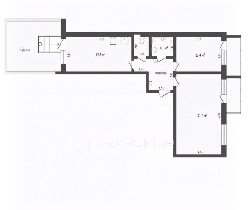 Планировочные решения: В квартире 2 стояка, что дает простор для фантазии дизайнера. Текущая планировка: Огромная кухня-гостиная 31,2 м² (2 окна + лоджия), родительская спальня с теплой лоджией, солнечная детская с выходом на террасу 16 м². Возможность перепланировки: Можно организовать кухню-гостиную в комнате 19,3 м² (получив выход на террасу из зоны готовки), а комнату 31,2 м² разделить на две жилые зоны.